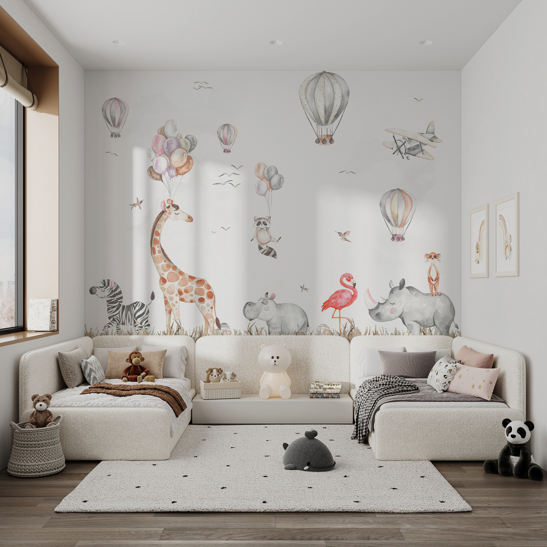 Imaginez que vous entrez dans une pièce où un monde fantaisiste prend vie. Cette peinture murale, qui représente un hippopotame joyeux parmi des amis tels qu’une girafe espiègle et un flamant rose coquin, apporte instantanément de la joie. Imaginez des enfants regardant vers le haut, les yeux écarquillés par l’émerveillement, tandis que des ballons flottent au-dessus d’eux – le genre de scène qui suscite les rires et les rêveries. Vous vous surprendrez peut-être à jeter un coup d’œil, vous aussi, transporté dans un après-midi insouciant où les animaux s’envolent. Il est parfait pour une chambre d’enfant ou une salle de jeux, mais honnêtement, qui ne voudrait pas de cette délicieuse ambiance n’importe où ? Qui sait ? Elle pourrait inspirer l’imagination débordante d’un enfant ou simplement rappeler à un adulte de prendre la vie un peu moins au sérieux. Une touche de fun qui ne manquera pas d’illuminer n’importe quel espace !