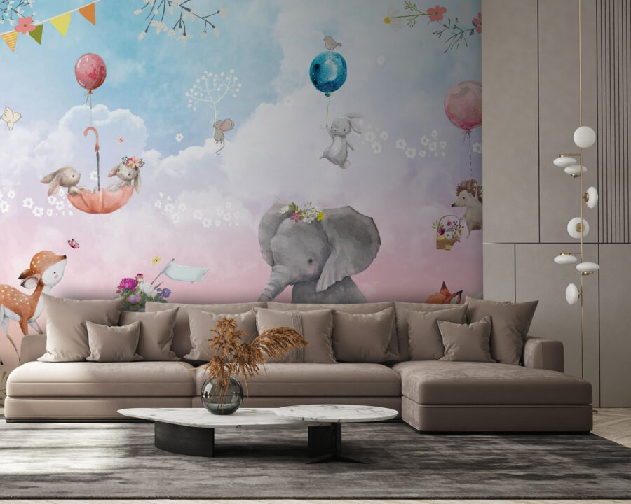 Transformez votre espace avec cette ravissante fresque murale représentant des animaux fantaisistes et des ballons joyeux. Imaginez un éléphant doux, orné de fleurs, partageant un moment avec des lapins espiègles et un hérisson curieux, tous baignant dans un ciel pastel de rêve. On se croirait dans une scène tirée d’un livre d’histoires enchanté !