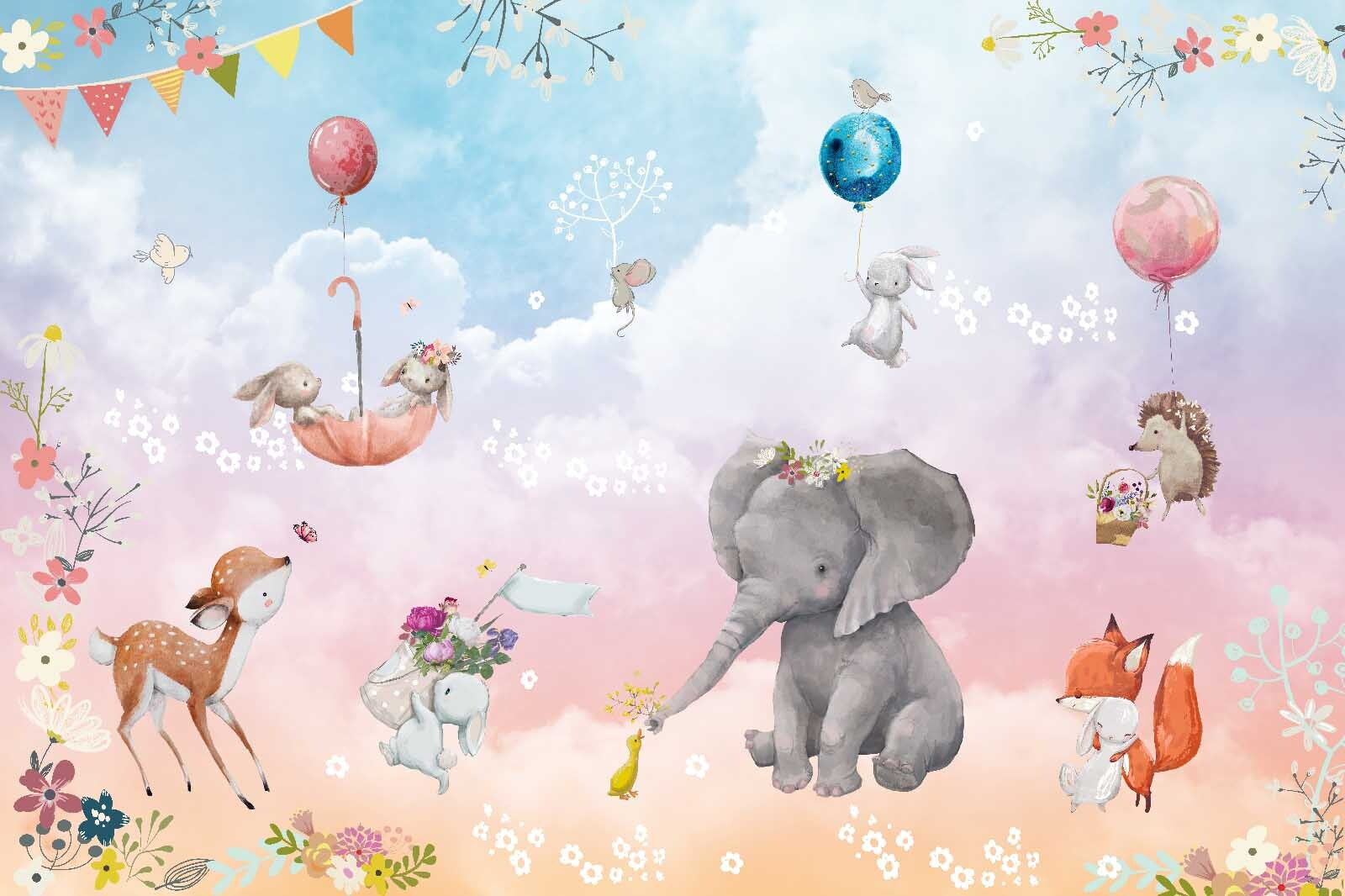 Transformez votre espace avec cette ravissante fresque murale représentant des animaux fantaisistes et des ballons joyeux. Imaginez un éléphant doux, orné de fleurs, partageant un moment avec des lapins espiègles et un hérisson curieux, tous baignant dans un ciel pastel de rêve. On se croirait dans une scène tirée d’un livre d’histoires enchanté !