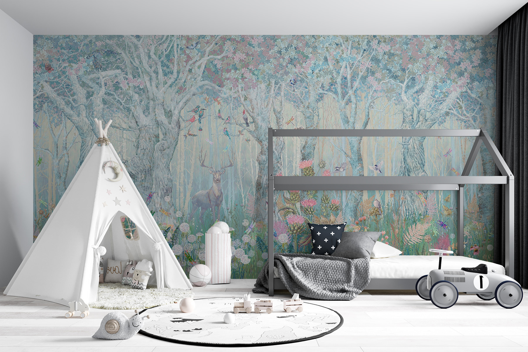 Plongez dans la fresque “Forêt enchantée”, où de gentils cerfs et des oiseaux fantasques font entrer une forêt magique dans votre salon. Imaginez une scène sereine s’étalant sur votre mur, débordant de pastels doux et d’une flore détaillée. Parfaite pour les amoureux de la nature, cette peinture murale transforme n’importe quel espace en une retraite tranquille. Imaginez accueillir vos invités avec une toile de fond aussi apaisante et magnifique – c’est comme entrer dans un conte de fées ! Qu’il s’agisse d’un salon, d’une chambre à coucher ou même d’un coin lecture confortable, cette peinture murmure le charme et la paix dans chaque coin. Ce n’est pas seulement une décoration, c’est une évasion instantanée dans une forêt paisible.