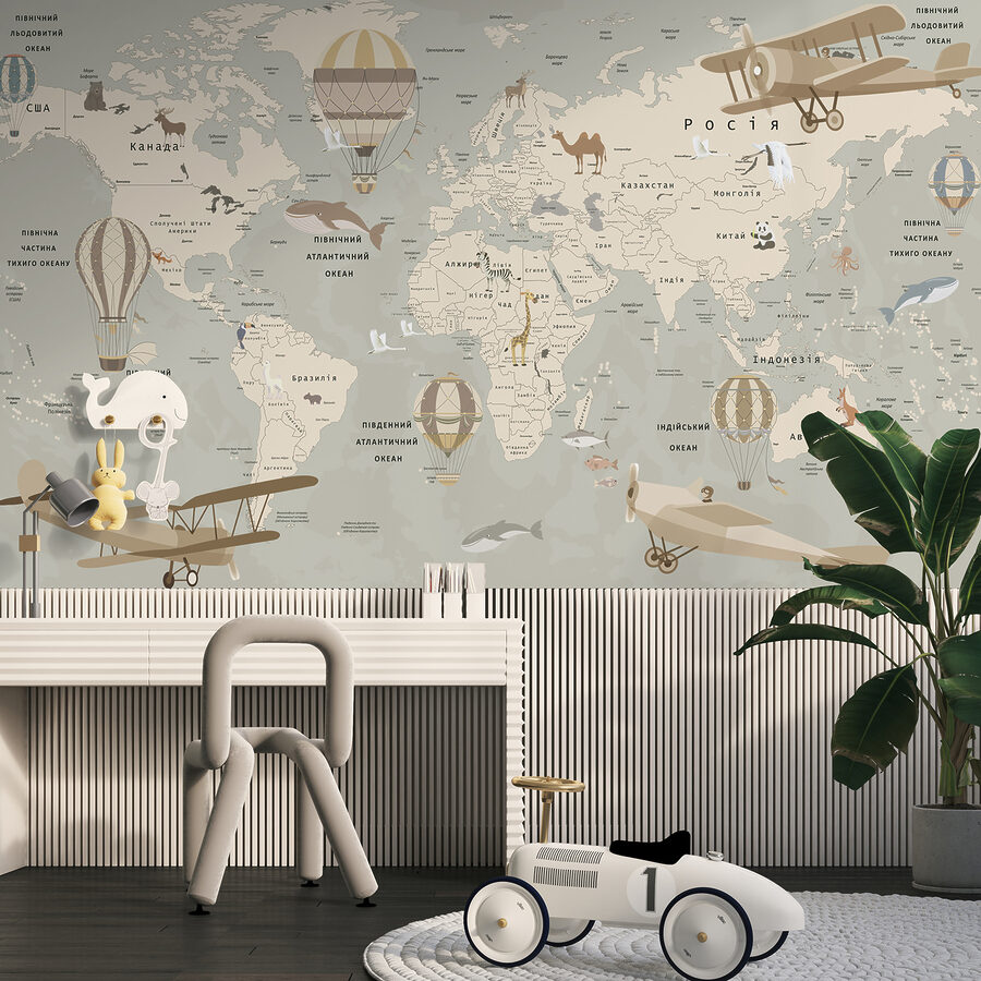 Les couleurs douces et discrètes rendent la chambre confortable et calme, parfaite pour les jeux et le coucher. De plus, il introduit sournoisement un peu de géographie – qui aurait cru que la décoration pouvait être éducative ? Et n’oublions pas les charmantes montgolfières qui parsèment la carte – un clin d’œil charmant aux anciens globe-trotters. Cette peinture murale n’est pas seulement un revêtement mural, c’est une expérience – un billet quotidien pour des contrées lointaines et des rêveries à profusion. Les enfants adoreront tracer leurs “voyages”, et vous adorerez la façon dont ils donnent vie à leur chambre. Simple, doux et tellement unique.