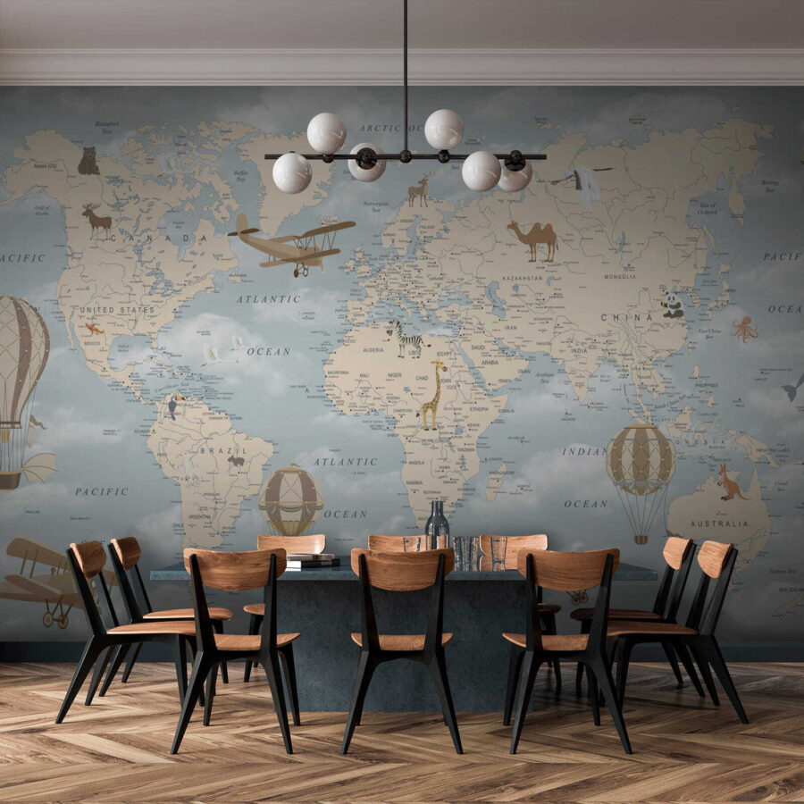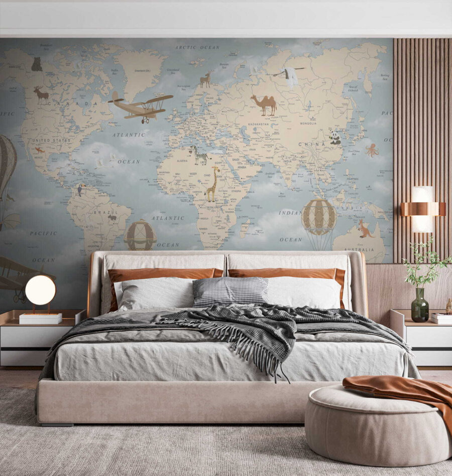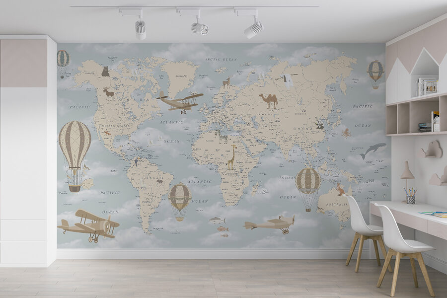 Imaginez que vous entrez dans une chambre d’enfant et que vous êtes accueilli par une charmante peinture murale représentant des montgolfières dérivant sereinement au-dessus d’une carte du monde pastel. C’est comme si vous faisiez un tour du monde dans le confort de votre maison. Parfaite pour susciter la curiosité et la rêverie, cette peinture murale regorge de détails fantaisistes : animaux ludiques, avions anciens et, bien sûr, ces montgolfières de rêve qui flottent au-dessus des océans et des continents, comme si elles vivaient leur propre petite aventure.
