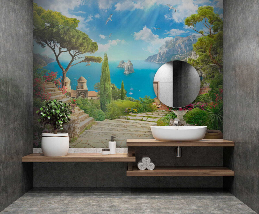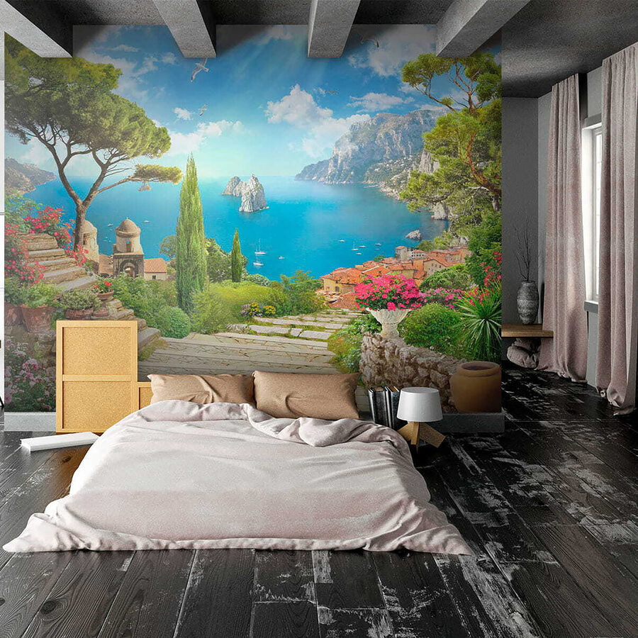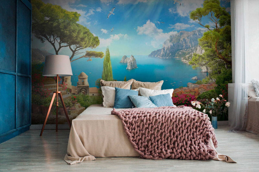 Imaginez : vous entrez dans votre salon, mais vous n’y êtes pas : une vue magnifique du bord de mer vous accueille. Avec les peintures murales “Oiseau volant dans le ciel”, vos murs s’illuminent. C’est comme si vous aviez ajouté une fenêtre avec une vue directe sur la Méditerranée, avec une touche de fantaisie. Pensez à de la verdure vibrante, à de charmants chemins de pierre et à des oiseaux qui s’envolent.