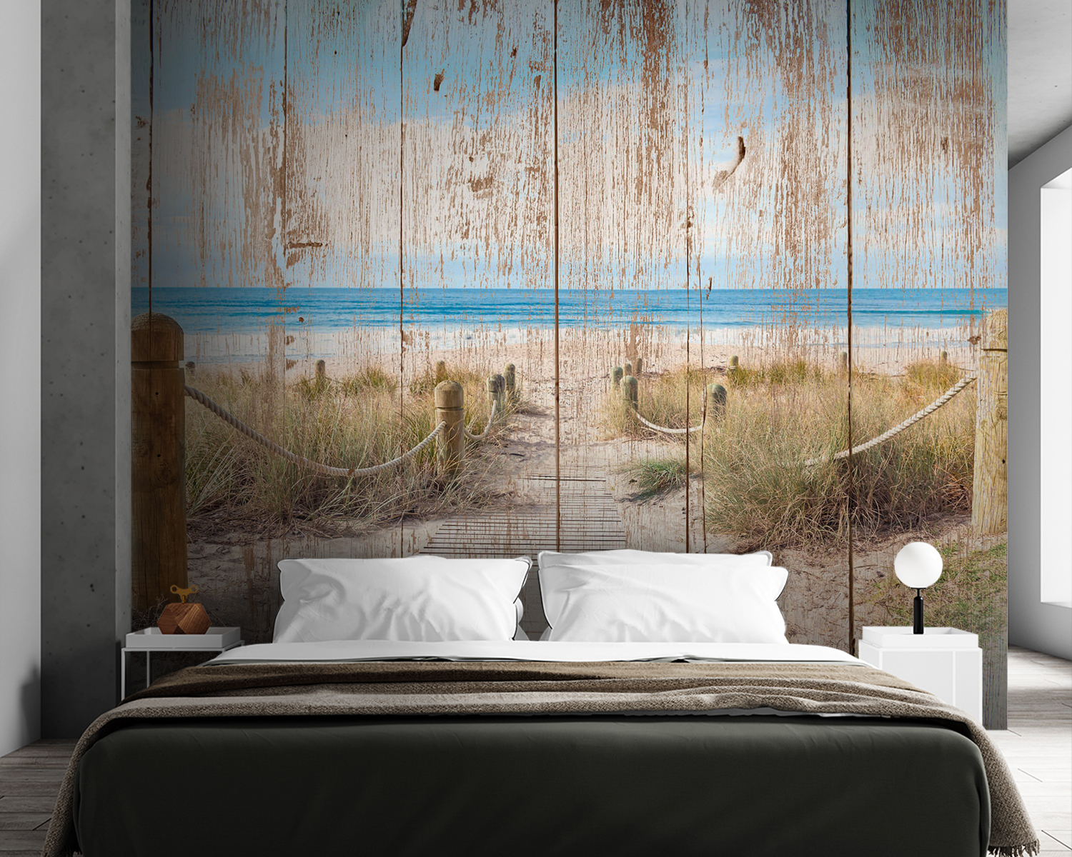Imagine stepping into a cozy beach cottage, even if you’re just at home. This mural, featuring that charming wooden path leading straight to the ocean, whispers stories of lazy summers and salty breezes. It’s like a mini-vacation every time you glance at it, don’t you think? The weathered wood adds a touch of nostalgia, as if it’s seen countless sunsets. Picture sipping your morning coffee while gazing at those gentle waves. Who knows, it might just inspire an impromptu beach trip! Perfect for any seaside lover looking to bring a bit of calm, fun, and a hint of adventure into their space.