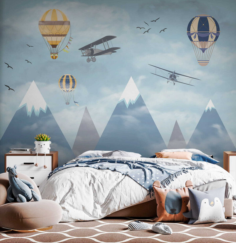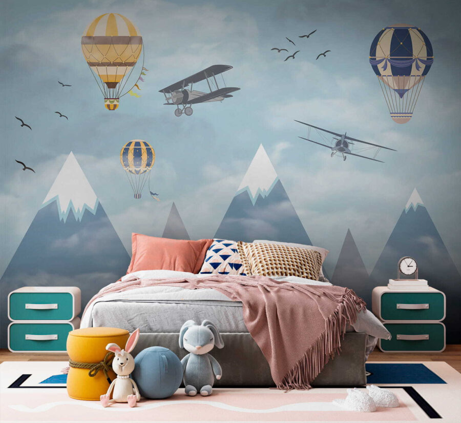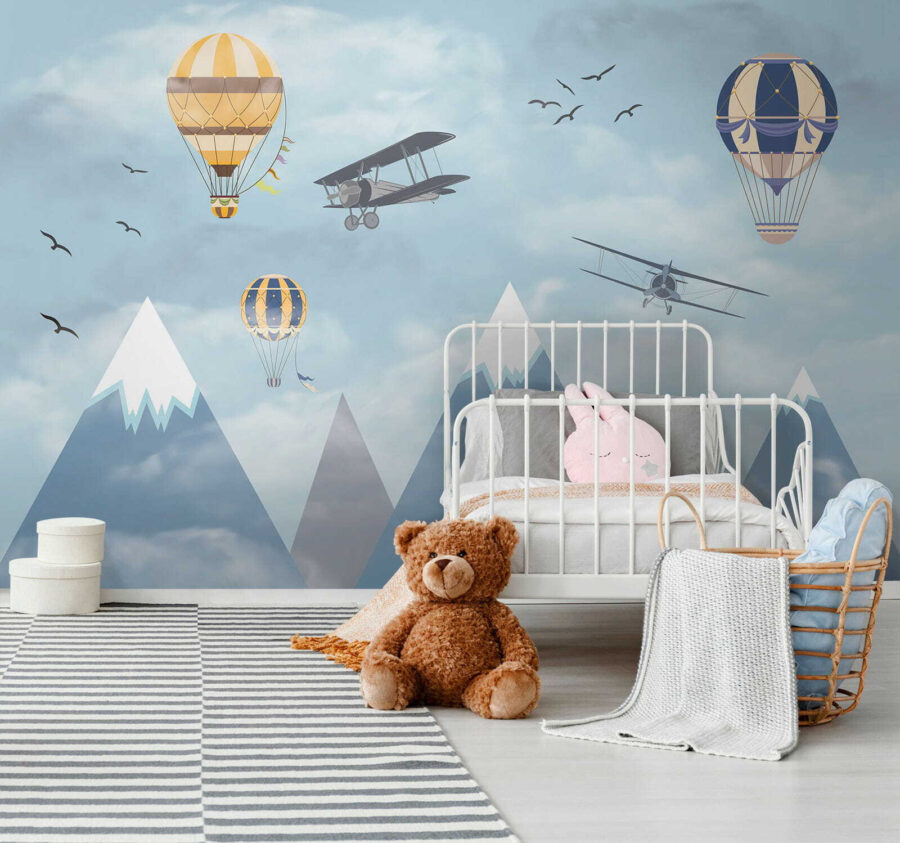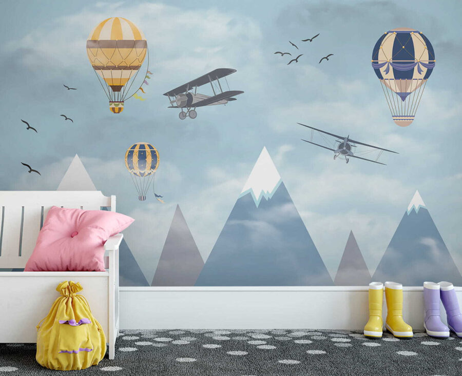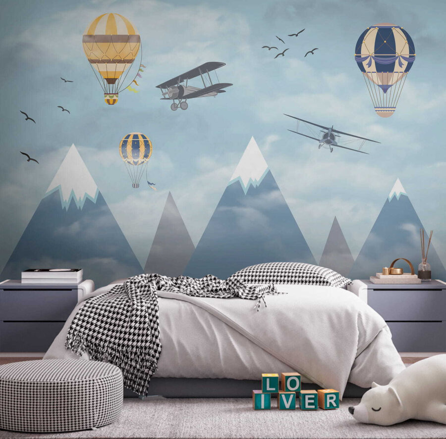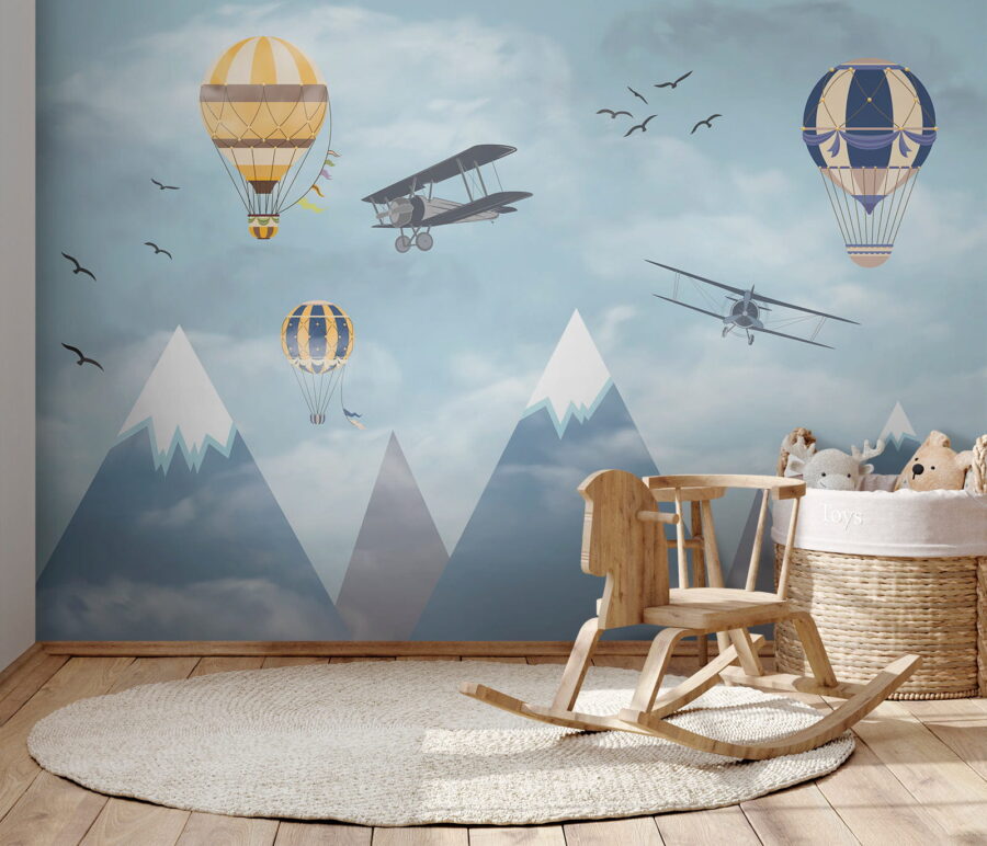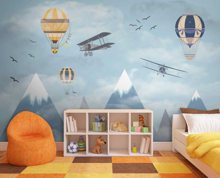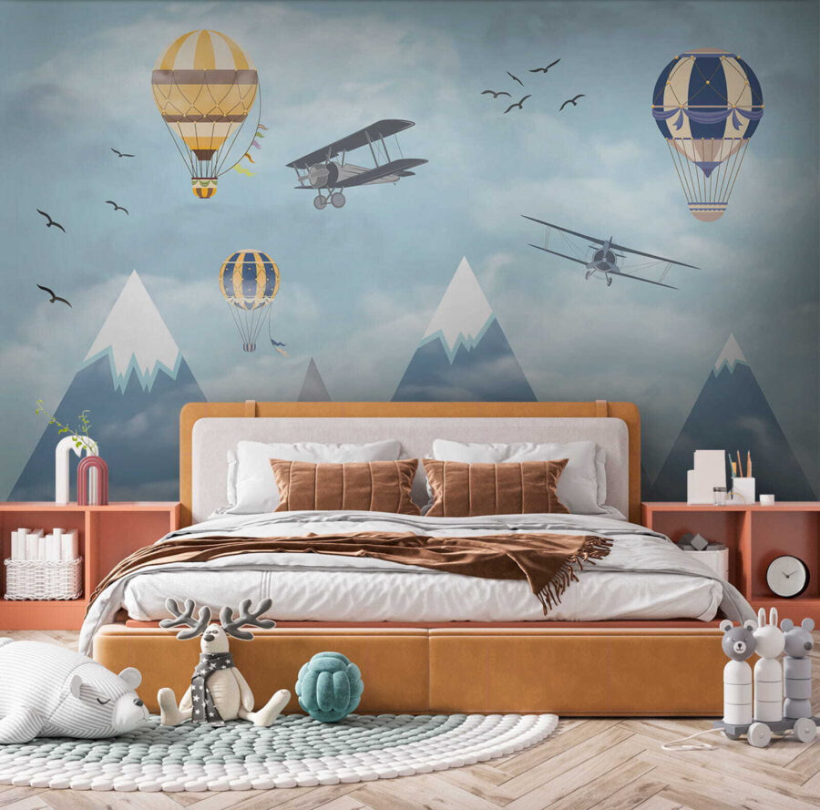 Imaginez que vous vous réveillez dans un ciel rempli de montgolfières fantaisistes flottant parmi les nuages, à côté d’avions aventureux qui passent et d’oiseaux qui s’envolent – c’est de la magie à l’état pur ! La peinture murale “Montgolfière dans le ciel” apporte un sentiment d’émerveillement et d’aventure dans la chambre. Parfaite pour stimuler la créativité et les rêves des enfants, c’est comme si on leur donnait une toile pour laisser libre cours à leur imagination. Les bleus pastel et les nuages doux sont si apaisants qu’ils donnent à l’espace une impression de légèreté et d’aération. Il ne s’agit pas seulement d’un décor, mais d’un voyage vers le ciel sans même quitter la pièce. Les parents peuvent également ressentir une certaine nostalgie, en se remémorant des rêves d’endroits lointains et de voyages audacieux. Qui n’aimerait pas avoir un peu de tout cela dans sa maison ? Et puis, ces montagnes enneigées en arrière-plan ? C’est tout simplement enchanteur. Cette peinture murale est en fait un rêve éveillé sous forme d’art mural – d’un charme infini et d’une sérénité magnifique. Les enfants l’adoreront, tout comme l’enfant qui sommeille en vous.