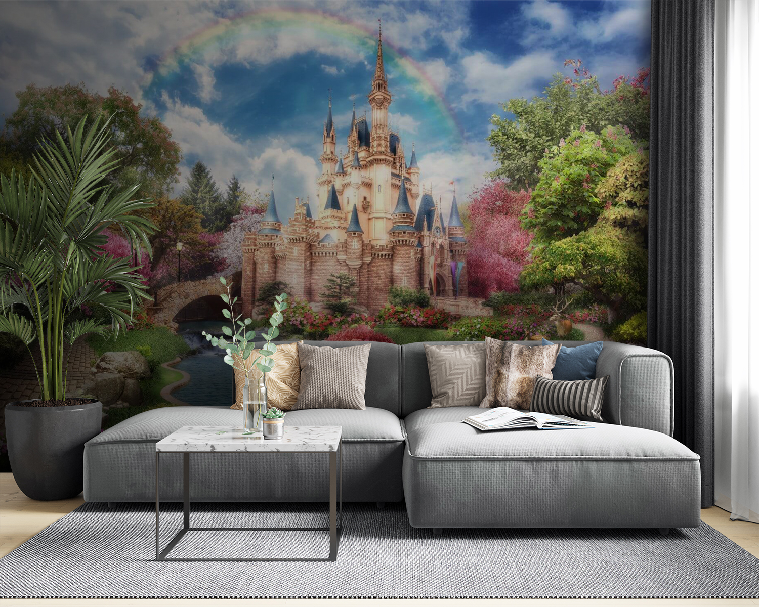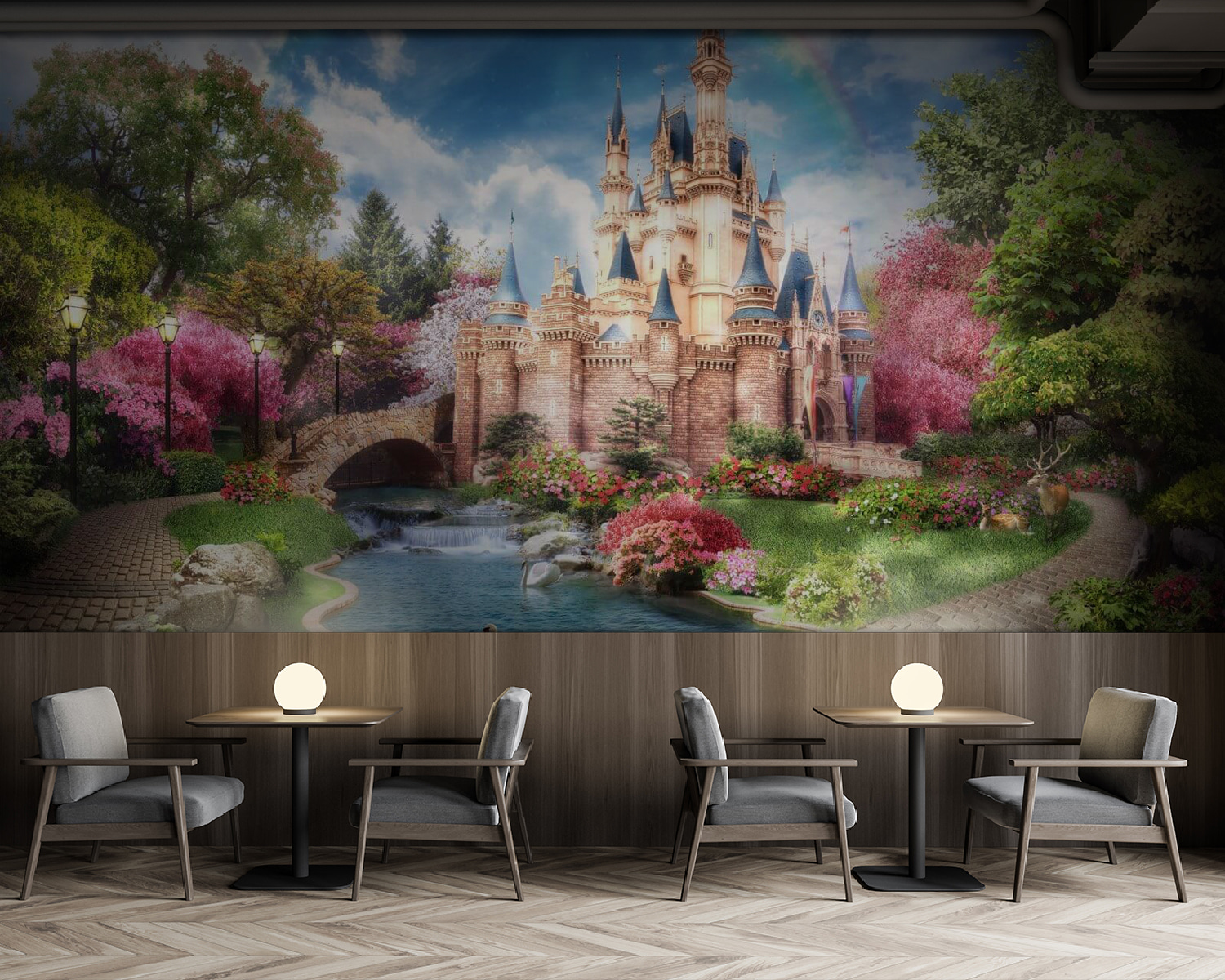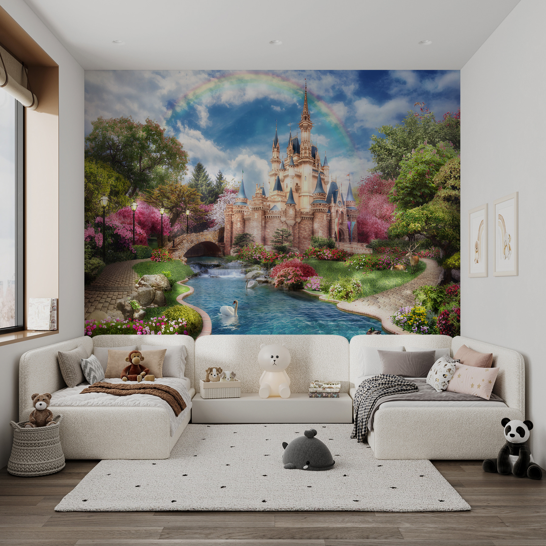 Imaginez que vous entrez dans un conte de fées avec la peinture murale “Château avec un arc-en-ciel dans le ciel”. Imaginez un charmant château niché au milieu d’arbres en fleurs, d’un étang serein et, bien sûr, d’un arc-en-ciel lumineux s’étirant dans le ciel – donnant à n’importe quelle pièce un aspect magique. Parfaite pour la chambre d’une fille ou le refuge d’un enfant, cette peinture murale transforme les murs en un lieu de rêve où l’imagination peut s’exprimer librement. Qui a besoin d’histoires pour s’endormir quand l’aventure est là, sur le mur ? Un chemin de jardin serein, des cygnes glissant sur l’eau et le château rayonnant d’enchantement – c’est comme votre propre fenêtre sur un monde de fantaisie. Imaginez les petits s’endormir en rêvant de contrées magiques et de quêtes épiques.