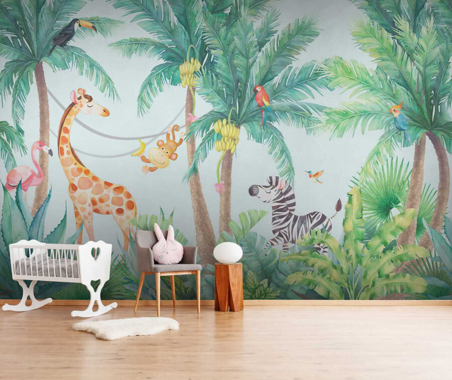 Illuminez la chambre de votre enfant avec ce ravissant “Muraux Tropical Animals Enjoying the Jungle Vibes” (Animaux tropicaux appréciant les vibrations de la jungle). Imaginez cette scène : des singes effrontés se balançant sur des lianes, une girafe amicale et un zèbre à l’air super détendu, le tout entouré de palmiers verts et luxuriants. C’est comme si vous aviez un mini safari dans la jungle à la maison ! C’est parfait pour faire naître l’amour de la nature et des animaux chez les petits explorateurs. Et honnêtement, qui ne voudrait pas se réveiller avec un flamant rose qui lui dit bonjour tous les matins ? Cette peinture murale apporte une bouffée de joie et d’aventure, rendant n’importe quel espace vivant et heureux.