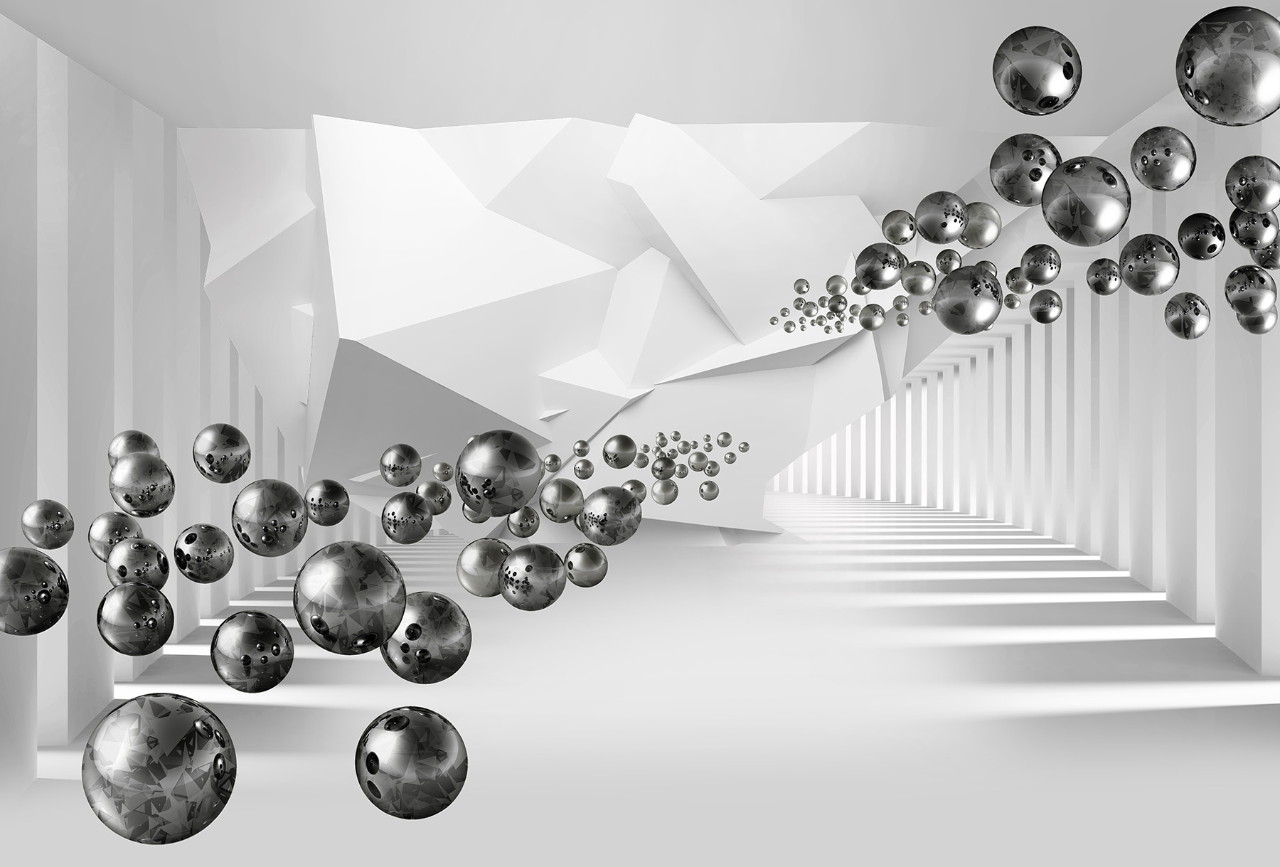 Papier peint Sphères flottantes dans un couloir géométrique Papier peint Sphères flottantes dans un couloir géométrique
