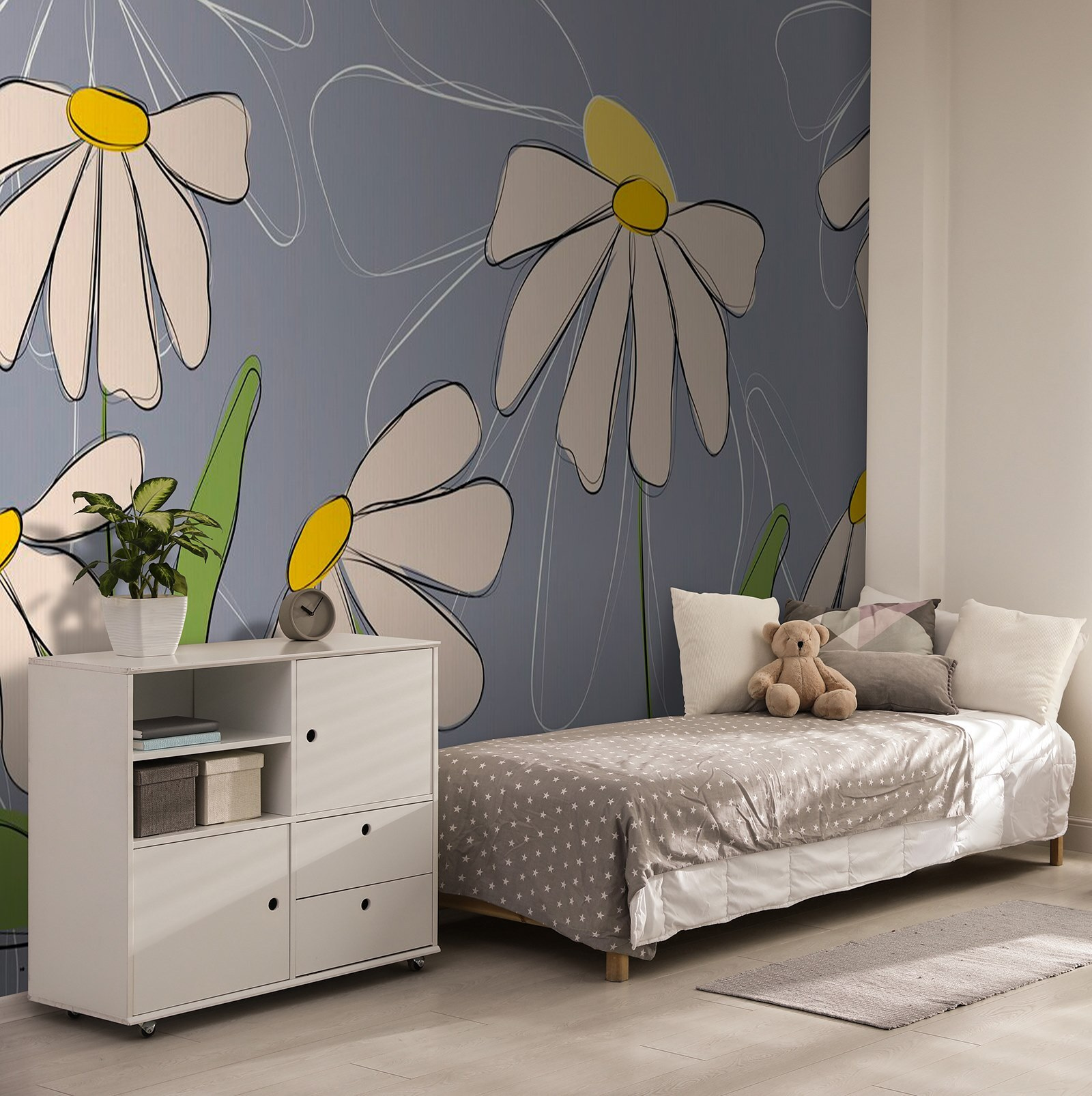 Brighten up any space with this whimsical mural! Featuring charming flowers set against a soft grey backdrop, it brings a touch of nature inside. Just picture it: waking up to these lovely blooms every morning, as if spring decided to crash right in your living room. The playful lines and soft colors whisper relaxation, perfect for cozying up with a good book or sipping coffee while daydreaming. It’s like having a mini garden that never wilts—no green thumb needed! Plus, it’s a fun way to liven up a boring wall. Go on, let these daisy pals brighten your day!