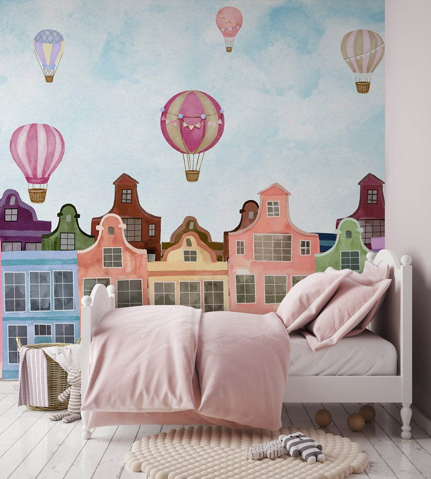 Every glance at this mural might just take you on a mini escape. Picture sipping your coffee while these vibrant buildings cheerfully gaze back at you, making mundane mornings feel special. Or, imagine how this beauty could inspire storytelling during family gatherings—everyone’s got their own balloon adventure. With its charming mix of colors, this mural will effortlessly lift your spirits like those hot air balloons floating on a sunny day. Perfect for a cozy nook, or that one wall that’s been feeling a bit lonely, it’s not just decor—it’s an experience waiting to happen.