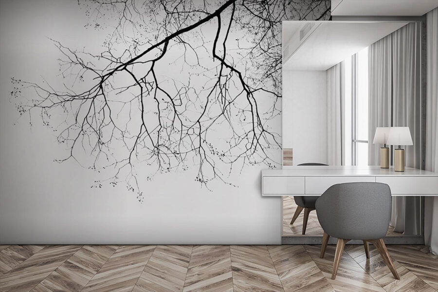 Vous cherchez à ajouter une touche de nature à votre espace sans le désordre des feuilles qui tombent ? Jetez un coup d’œil à cette superbe peinture murale de branches dénudées créant des motifs complexes. C’est comme si vous apportiez le calme d’un bosquet enneigé dans votre salon. Facile à regarder et remplie d’effets dramatiques subtils, elle donne l’impression d’un moment figé dans le temps, celui dont vous espérez secrètement qu’il se transformera en esprit de l’arbre.