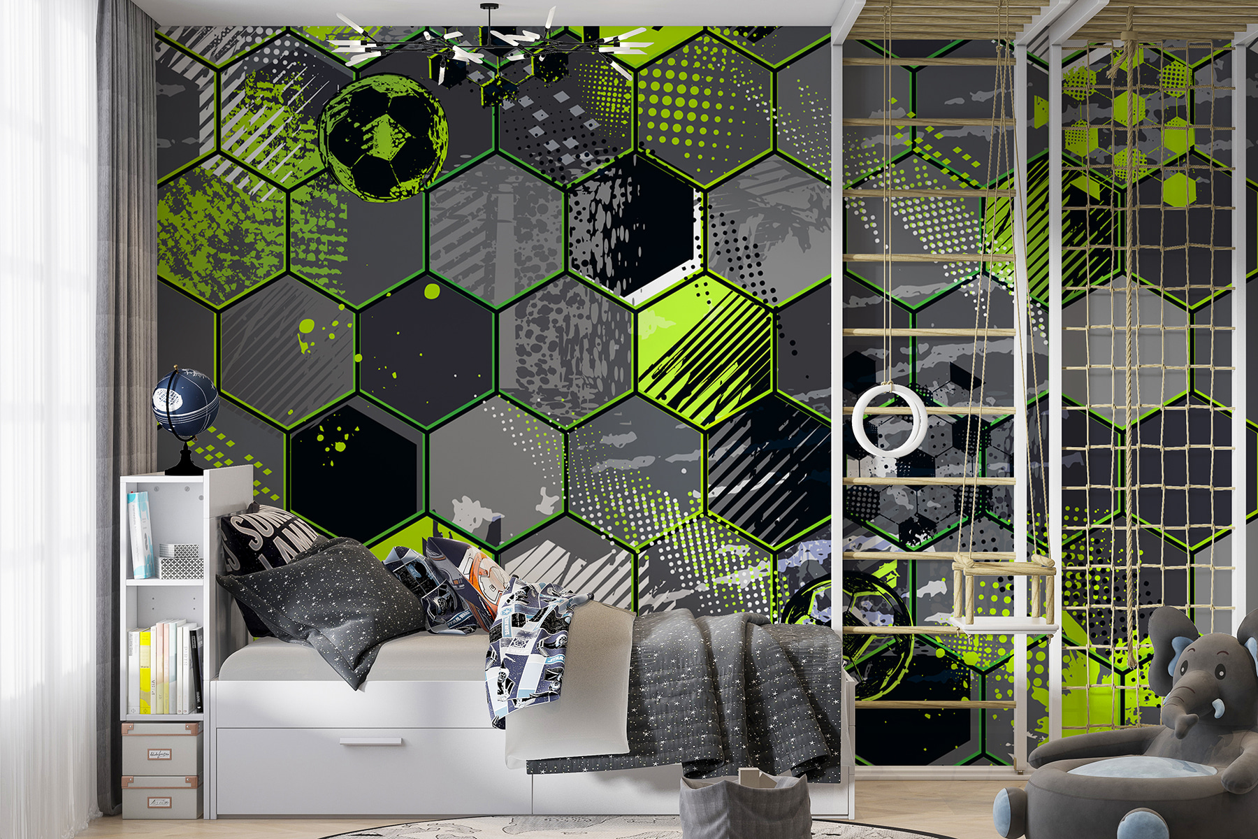 Le motif a un côté hexagonal funky, avec des éclaboussures de vert fluo et de gris épuré. C’est comme si un terrain de football était entré en collision avec l’art moderne. Parfait pour tous ceux qui aiment avoir une touche de fun et une touche de style dans leur décor. Ce n’est pas un simple papier peint, c’est une déclaration. Imaginez : vous vous réveillez, vous prenez votre café et vous avez une petite bouffée de bonheur chaque fois que vous passez devant. C’est un excellent sujet de conversation pour les amis qui viennent vous demander “Où as-tu trouvé ça ?”.