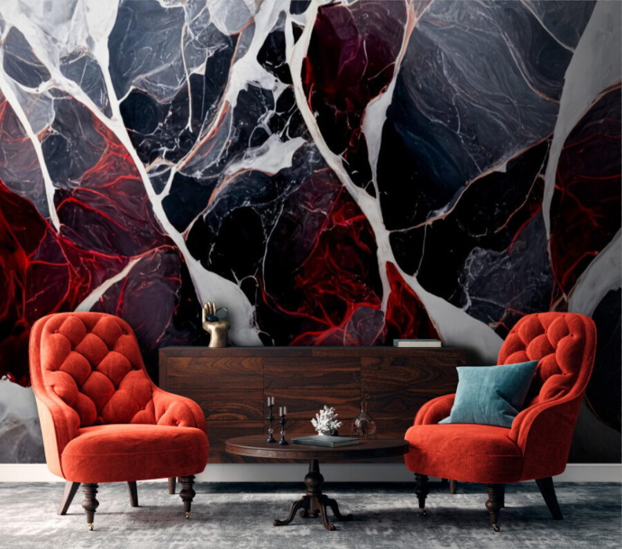 Vous n’avez jamais pensé que votre mur pouvait être plus qu’un simple mur ? Laissez-moi vous présenter ce chef-d’œuvre rouge et noir. C’est comme si vous aviez une œuvre d’art abstraite dans votre salon, sauf que vous n’avez pas besoin d’être très chic pour cela. Cette peinture murale mélange des noirs profonds, des gris fumés et des rouges ardents d’une manière qui crie “Je suis bien plus cool qu’un mur peint”. Imaginez : vous rentrez chez vous après une longue journée et, au lieu d’un beige ennuyeux, vous êtes accueilli par ce motif audacieux qui vous énergise et vous réconforte à la fois. Le marbre a un aspect dramatique sans être froid, ce qui est parfait pour les coins douillets ou les murs qui ont besoin d’un peu plus… d’énergie. Transformez votre espace en galerie d’art, ou simplement en un lieu où les conversations commencent d’elles-mêmes. Allez-y, perdez-vous dans ses profondeurs !