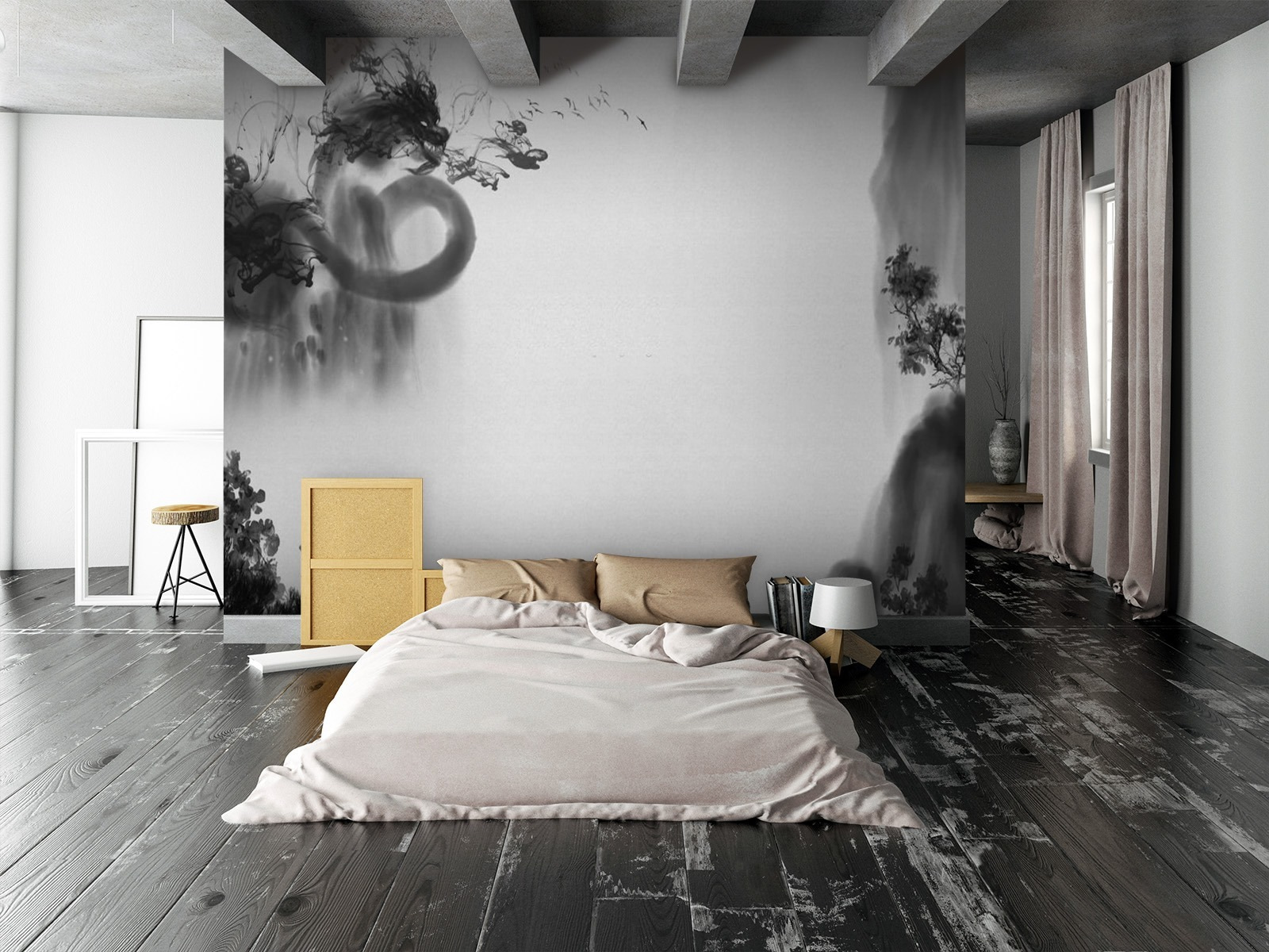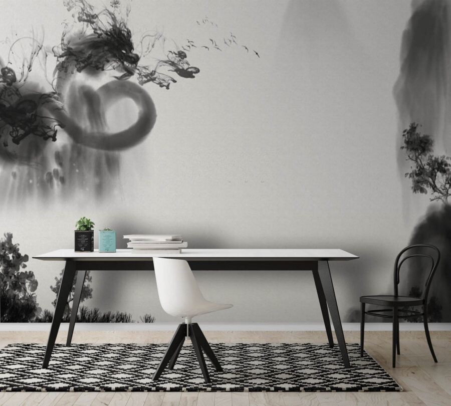 Jetez un coup d’œil à cette fresque murale en noir et blanc ! C’est un peu comme un mélange de classique et d’artistique. Imaginez que vous entrez dans une pièce et que vous êtes accueilli par cette scène mystérieuse, presque onirique. Elle a cet aspect qui vous fait penser à de l’encre fumée tourbillonnant sur du papier, avec des touches de paysages et de formes abstraites se mélangeant les unes aux autres.