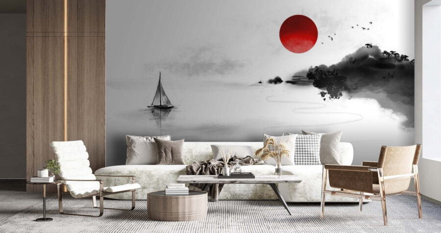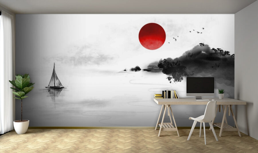 Imaginez que vous entriez dans une pièce et que vous soyez accueilli par une scène aussi paisible – cette peinture murale de rêve représente un cercle rouge sur un fond blanc serein. C’est comme une petite œuvre d’art zen. Le soleil rouge se détache de façon frappante, offrant une touche de couleur revitalisante qu’il est difficile d’ignorer. Ajoutez à cela un paysage doux et brumeux, et vous obtenez l’équilibre parfait entre calme et dynamisme.