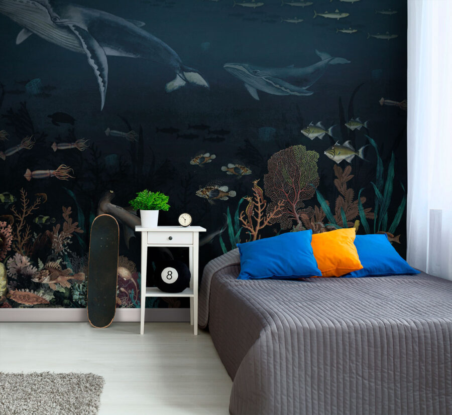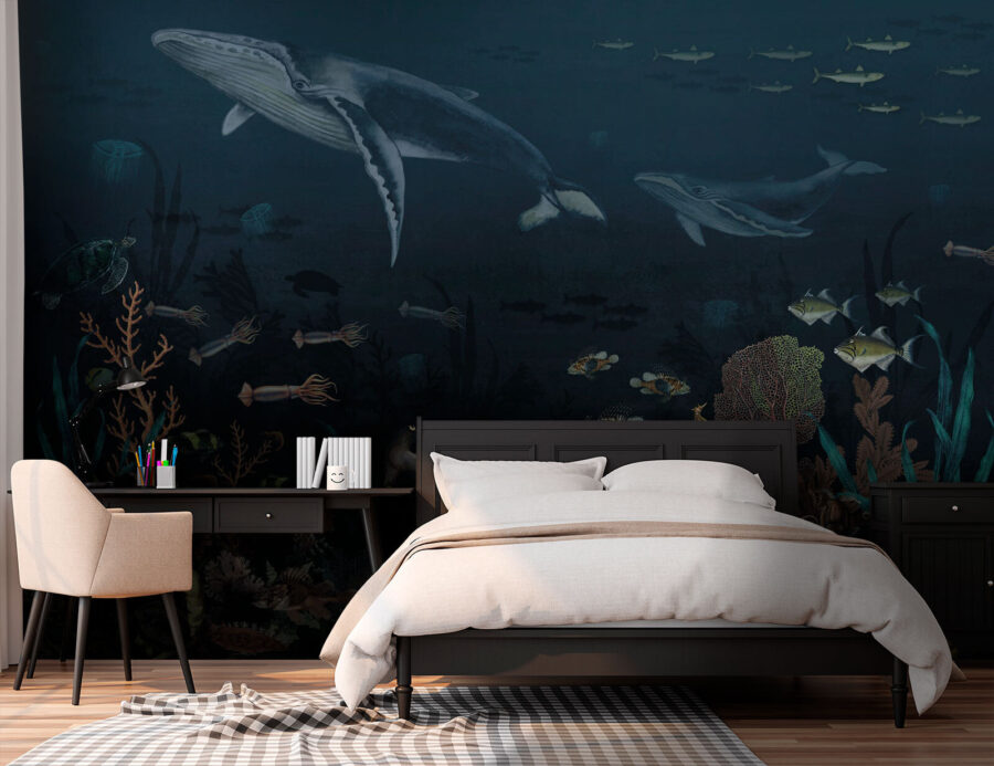 Plongez dans un monde d’émerveillement avec cette peinture murale captivante de baleines glissant gracieusement dans les profondeurs ! Imaginez : vous entrez dans une pièce et voilà qu’une baleine majestueuse nage aux côtés de poissons colorés, de tortues de mer et de coraux éclatants. Ce tableau procure instantanément un sentiment de calme et d’aventure. Parfaite pour une chambre d’enfant ou un espace inspiré du bord de mer, cette peinture murale stimule l’imagination et vous fait rêver d’escapades océaniques. Imaginez les histoires qu’il pourrait raconter ! Que ce soit à l’heure du jeu ou du coucher, cette peinture murale plante le décor d’innombrables aventures aquatiques – et qui ne voudrait pas de cette magie sur ses murs ? Vous aurez l’impression d’avoir un petit bout d’océan chez vous.