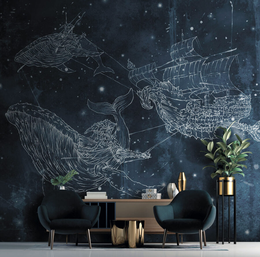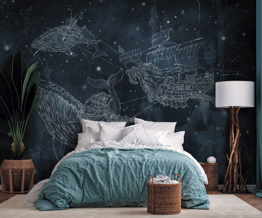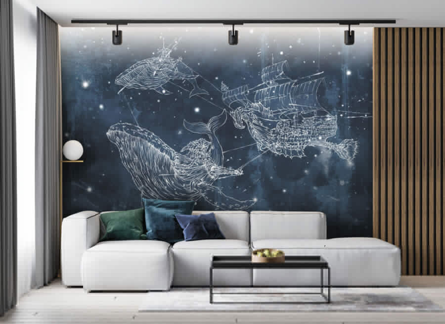 Imaginez que vous vous réveillez avec une baleine qui vous chante la sérénade depuis votre mur ! Cette peinture murale “Dessin d’une baleine” est comme une plongée dans une mer magique – ce n’est pas une décoration murale ordinaire. Parfait pour les enfants qui rêvent d’aventures marines et pour les adultes au cœur jeune qui veulent ajouter une touche d’émerveillement océanique à leur espace. Un mélange d’étoiles, de baleines et d’un mystérieux navire navigue dans les bleus du crépuscule, créant un paysage nocturne fantaisiste. C’est comme une histoire à dormir debout. Laissez-vous emporter par cette scène enchanteresse au pays des rêves ou faites voguer n’importe quelle pièce sur une vague de créativité et d’émerveillement. Partez en mer !