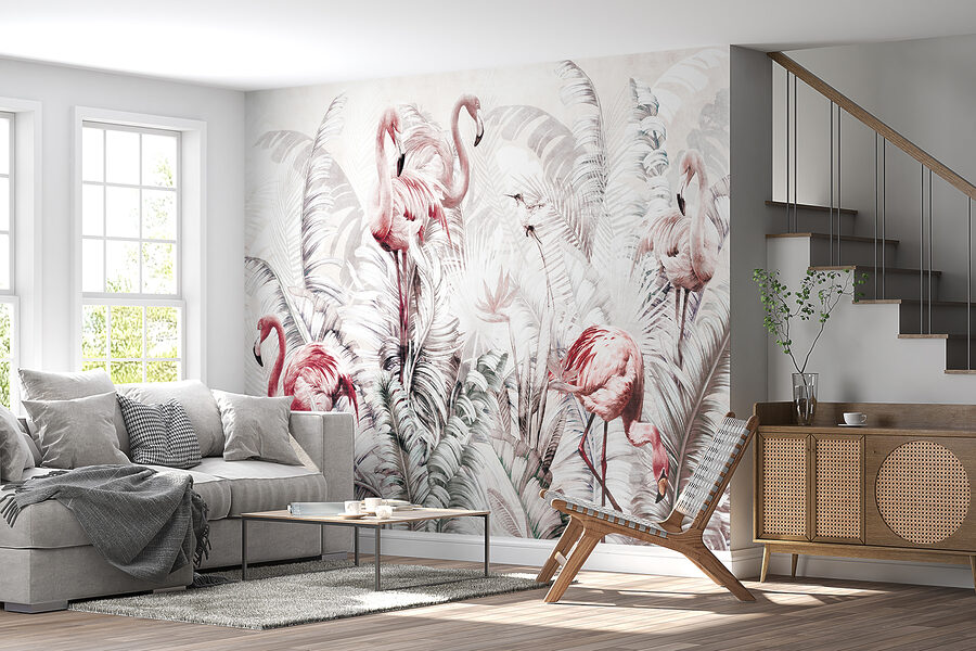 Que ce soit pour votre salon, votre chambre à coucher ou même un espace de bureau créatif, cette peinture murale ajoute une touche ludique mais sophistiquée. Les douces nuances pastel se mélangent sans effort avec le rose flamant audacieux, donnant à l’ensemble l’impression d’un rêve éveillé paisible.