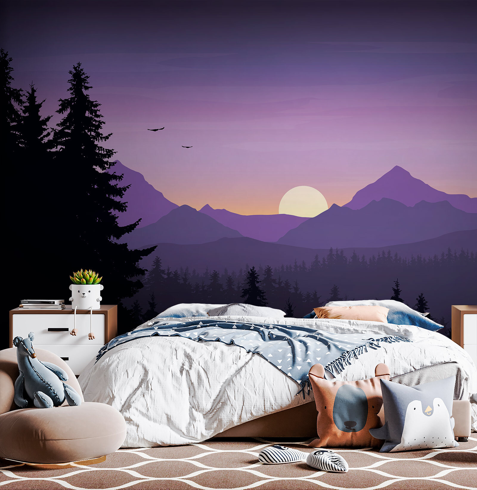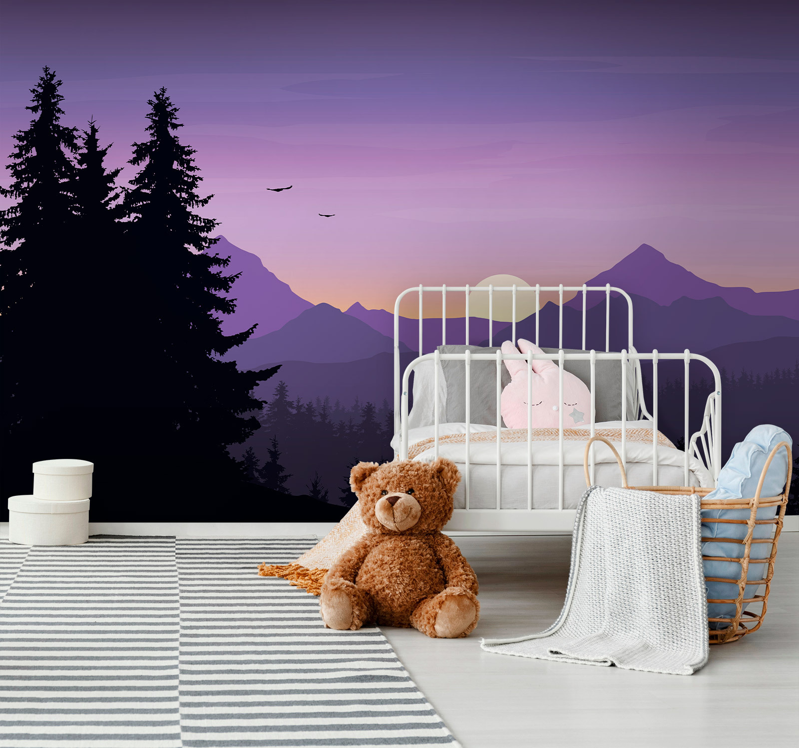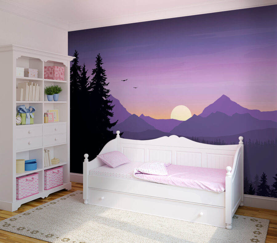 Imaginez-vous dans un refuge douillet, entouré par la beauté sereine de la nature, sans jamais quitter votre maison. Cette fresque murale, représentant un paysage magnifique d’arbres et de montagnes, transpose ce rêve directement sur vos murs. Des teintes douces de violet dansent dans le ciel au coucher du soleil, projetant une lueur envoûtante. C’est comme votre propre escapade paisible, où le stress s’envole. Imaginez-vous lové avec un bon livre ou en train de partager des histoires avec des amis, tout en profitant de cette vue tranquille. Chaque regard sur ces montagnes majestueuses et ces grands arbres pourrait bien vous inspirer une petite aventure, ou du moins vous faire rêver. Parfait pour les amoureux de la nature et ceux qui cherchent à ajouter une touche de calme à leur espace. Pourquoi ne pas laisser vos murs parler à votre place ? Après tout, qui ne voudrait pas profiter d’un peu de grand air à l’intérieur ?