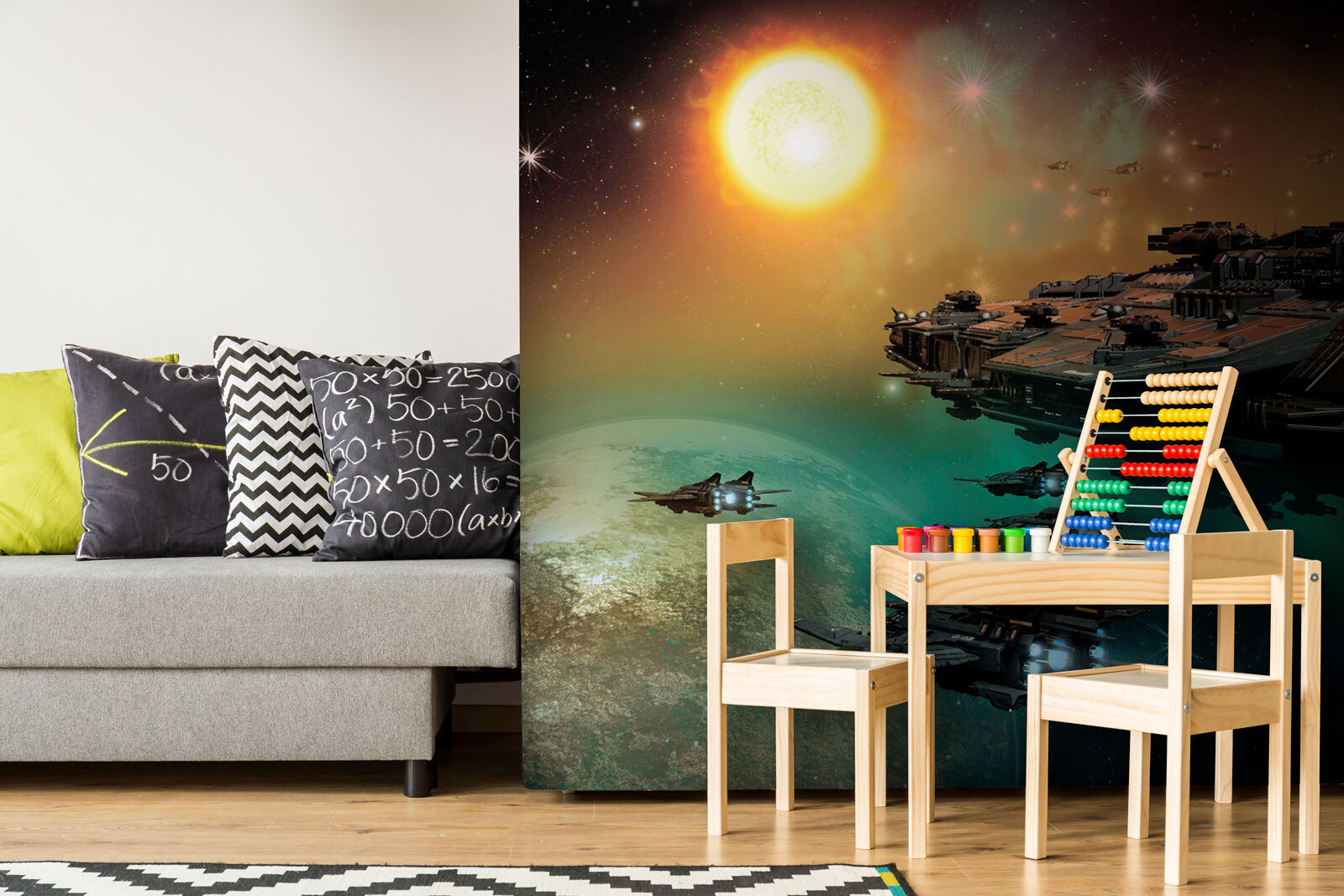 Parfaite pour la chambre d’un amateur d’espace ou d’un enfant, les vaisseaux détaillés, le soleil rougeoyant et les planètes lointaines donnent à la pièce l’impression d’une scène tout droit sortie d’une superproduction de science-fiction. Cette ambiance magique vous fera rêver de galaxies très, très lointaines. De plus, c’est bien plus cool que de regarder un simple mur, n’est-ce pas ? Vous pouvez presque entendre le ronronnement des moteurs et ressentir le frisson de l’exploration spatiale. Sérieusement, cela pourrait vous inciter à devenir astronaute… ou au moins à revoir vos films préférés sur l’espace. Ajoutez un peu d’univers à votre vie quotidienne – ramenez les étoiles à la maison !
