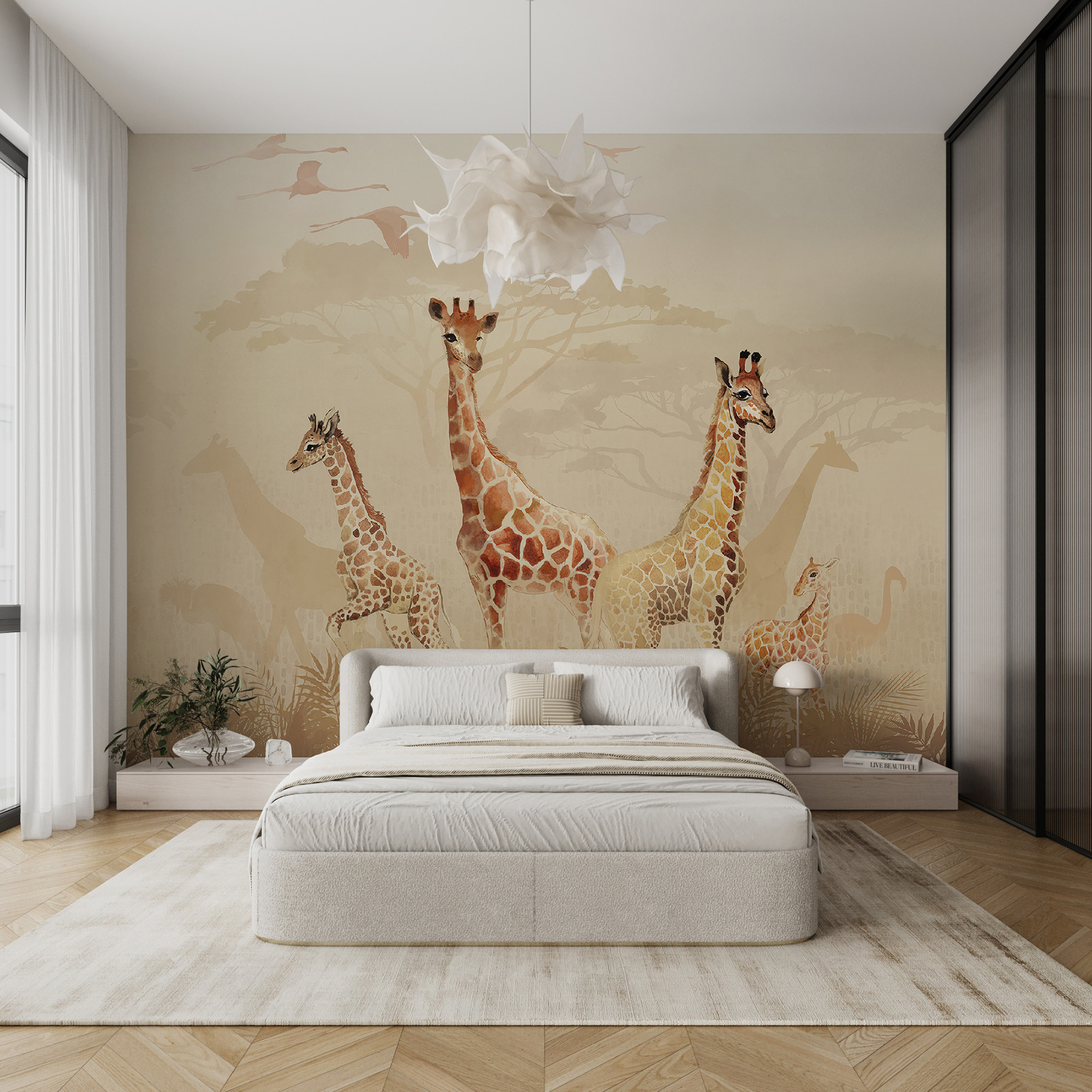 Les girafes ont quelque chose de fantaisiste et d’apaisant ; ce sont les doux géants du monde animal. Cette peinture murale capture de manière créative leur grâce et leur sérénité, donnant à toute pièce une impression de grandeur et de détente. Parfait pour une chambre d’enfant ou même pour apporter une touche d’originalité à votre bureau. De plus, les couleurs douces sont agréables à regarder et s’intègrent parfaitement à presque tous les styles de décoration.