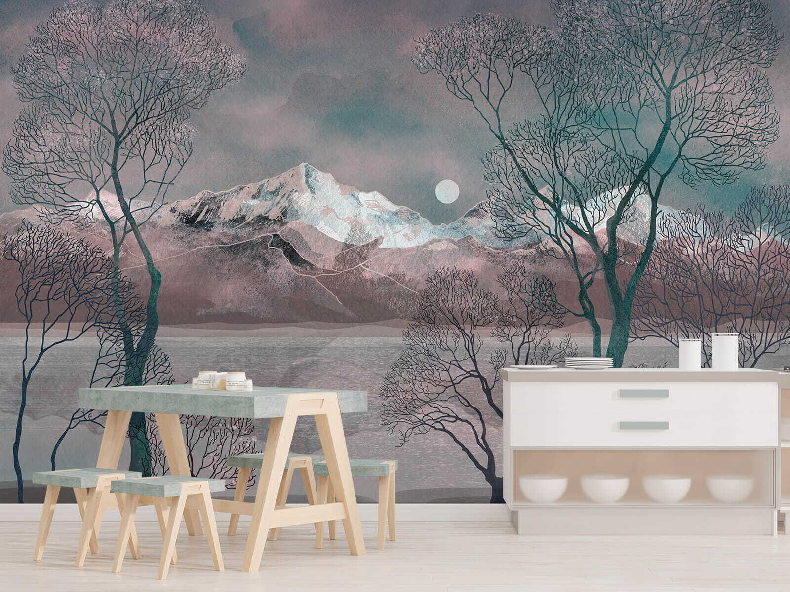 Transform any space with this stunning wall mural, “Landscape with Trees and Mountains.” It’s like bringing nature indoors without the pesky bugs! Imagine watching the sun peek behind the mountains, casting gentle shadows as trees sway softly in the breeze. The colors whisper calmness, making it perfect for a cozy reading nook or even a lively gathering spot—everyone’s gonna want to chat about it! It adds depth and character, which is great because who wants boring walls? So go ahead, let this mural be the showstopper that steals everyone’s breath away, even if just for a moment!