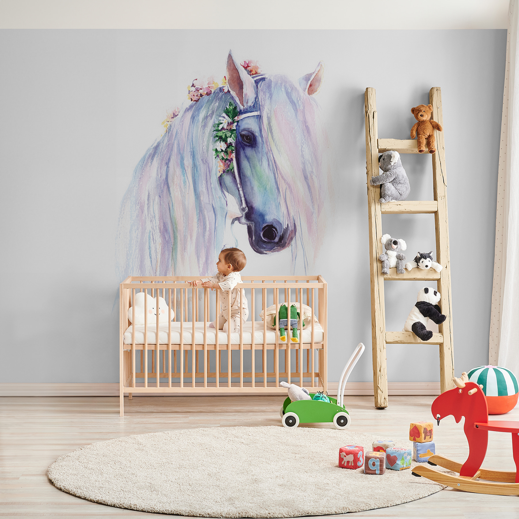 Illuminez n’importe quel espace avec cette ravissante peinture murale représentant un cheval majestueux orné de fleurs. Imaginez que vous entrez dans une pièce et que vous êtes accueilli par ce gentil géant, dont l’élégante crinière tombe en cascade comme une chute d’eau colorée. Parfait pour les enfants et les amateurs de décoration fantaisiste, il apporte une touche de nature à l’intérieur. Les pastels doux donnent une impression de légèreté, et il est difficile de ne pas sourire. Imaginez que vous lisez une histoire avec vos enfants tout en étant niché près de cette peinture murale – chaque coup d’œil est une petite aventure qui ne demande qu’à se produire. Ce n’est pas seulement une décoration, c’est une invitation à rêver !
