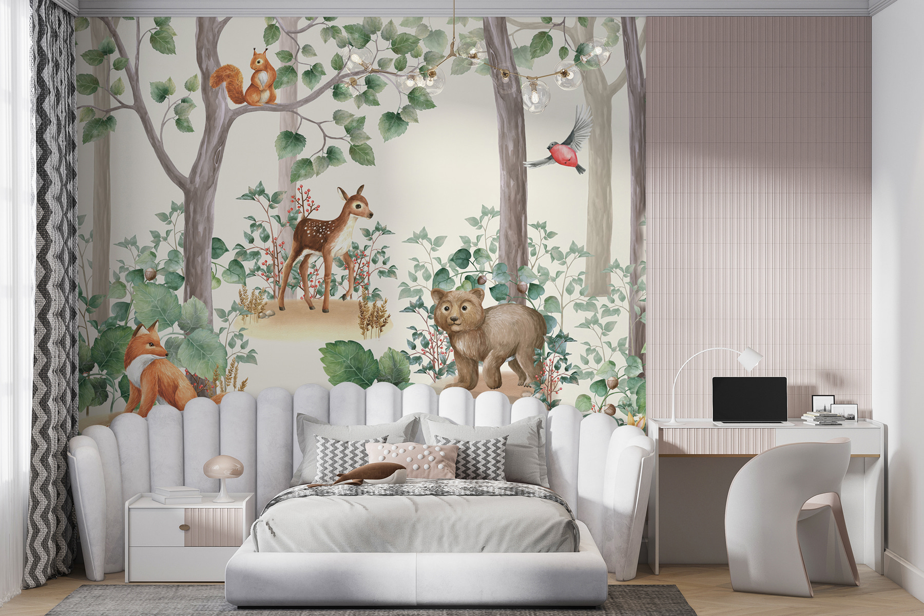Imaginez le visage de votre enfant s’illuminer à chaque fois qu’il entre dans sa chambre avec ce “Muraux animaux de la forêt parmi les arbres”. Peint dans un style aquarelle doux, ce mural apporte le charme paisible d’une scène de forêt directement sur vos murs. Vous verrez des écureuils grimper aux arbres, un cerf timide jeter un coup d’œil et même un ours curieux ! C’est comme si vous entriez dans leur livre d’histoires préféré.