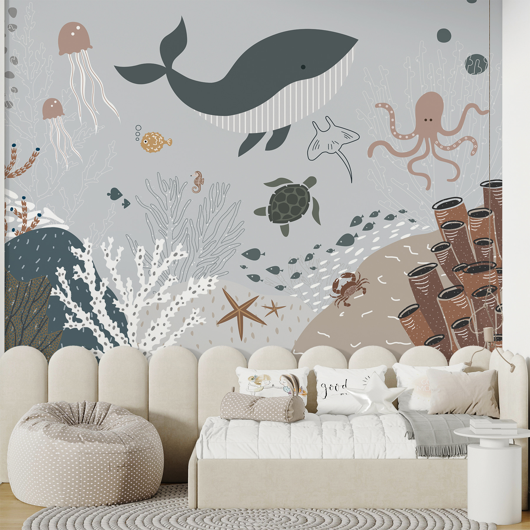 Imaginez transformer la chambre de votre enfant en un monde sous-marin enchanteur grâce à cette peinture murale ludique “Dessin animé d’une baleine”. Parfaite pour une chambre d’enfant, cette peinture murale représente des créatures marines sympathiques telles que des baleines, des tortues et des méduses dans de douces teintes d’aquarelle. C’est comme si vous faisiez entrer une partie de l’océan dans votre maison sans vous mouiller !