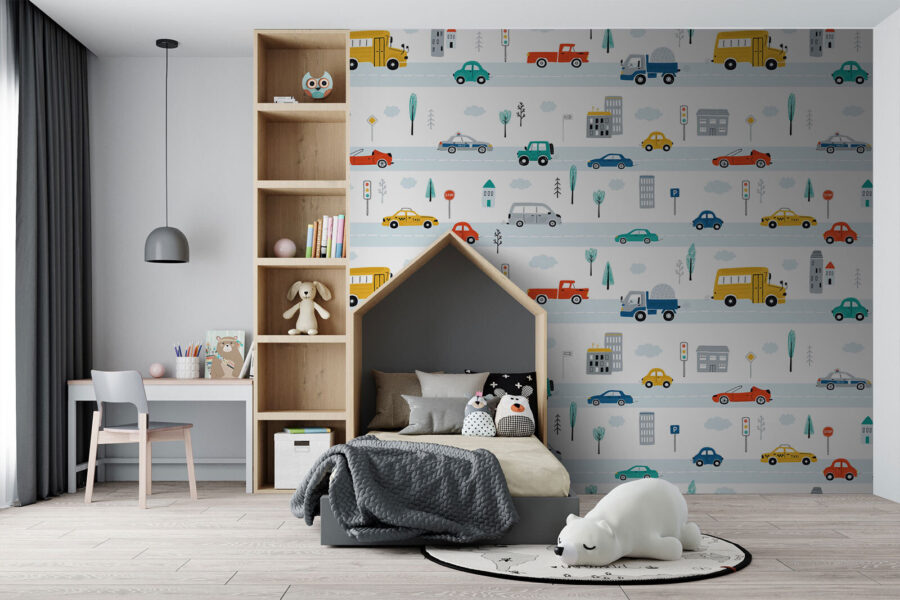 Les enfants vont adorer repérer le bus scolaire, le taxi et même la voiture de police – un petit embouteillage qu’ils seront heureux de regarder ! Il fait partie de notre collection de peintures murales pour enfants, idéale pour ajouter une touche d’humour à une salle de jeux ou à une chambre. Imaginez que les histoires racontées à l’heure du coucher se transforment en aventures imaginatives et que votre enfant rêve d’escapades en ville chaque nuit. Cette peinture murale a tout pour plaire : une pincée de fantaisie, un soupçon d’aventure et beaucoup de caractère. De plus, il est très facile de l’intégrer à un décor existant – une délicieuse toile de fond pour la vie de tous les jours !