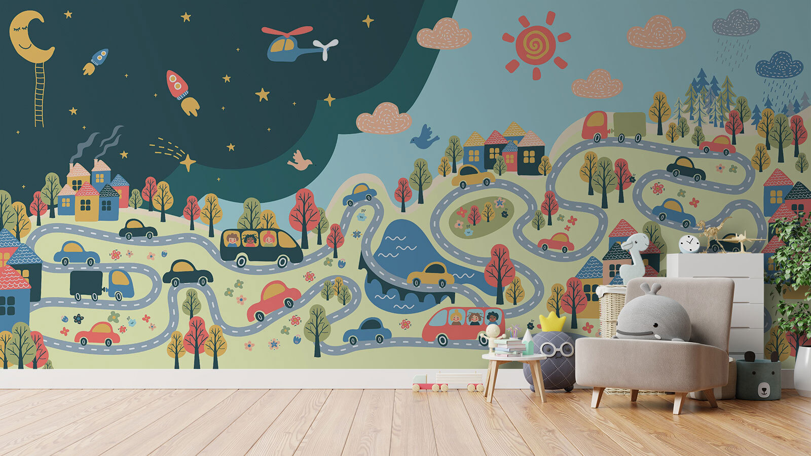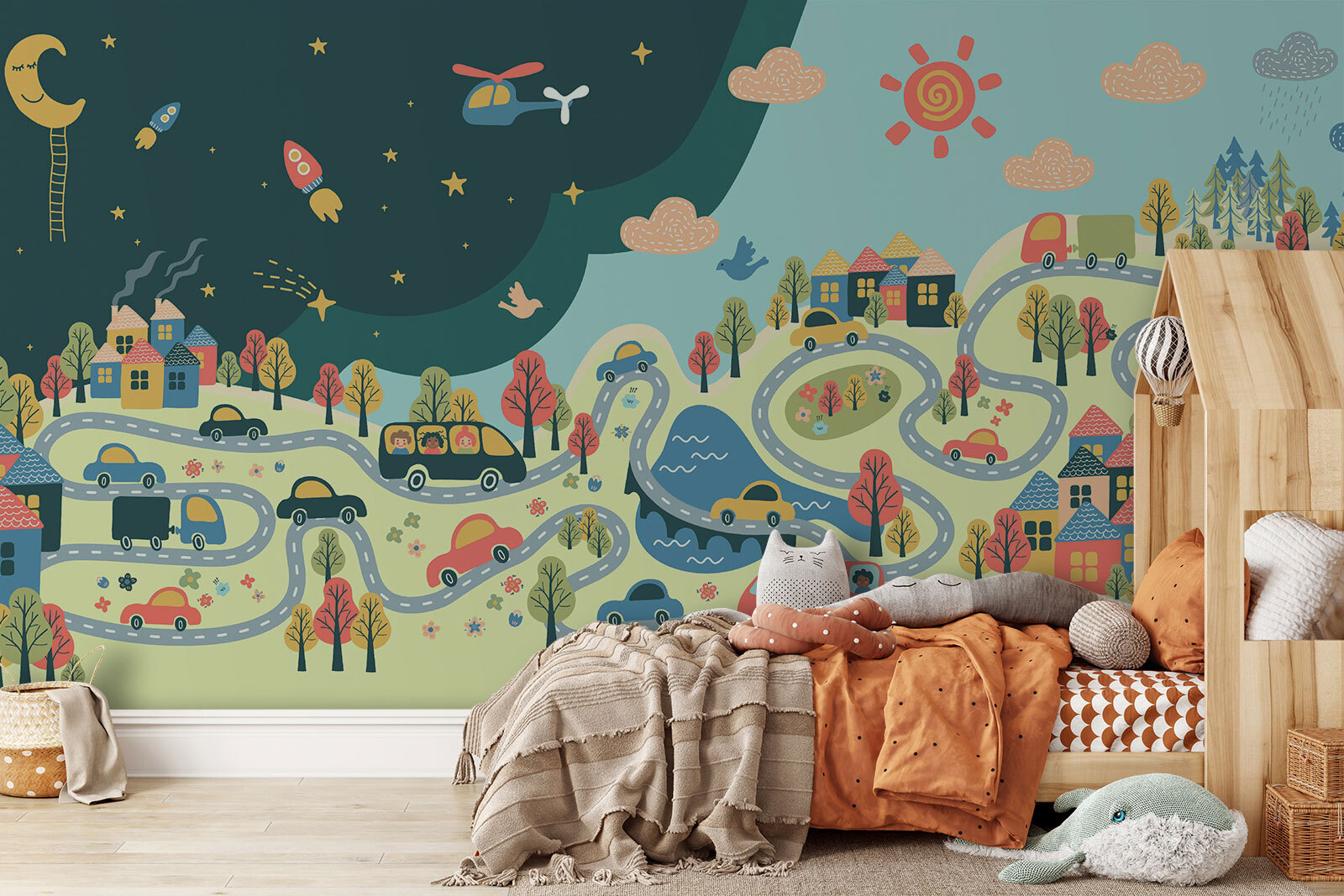 Cette peinture murale “Dessin animé d’un hélicoptère et d’une fusée dans le ciel” apporte tout un monde fantaisiste à la chambre de votre enfant. Imaginez vos enfants s’endormir sous un ciel nocturne et rêveur, avec des fusées et un hélicoptère sympathiques, comme s’ils faisaient partie d’une charmante aventure de livre d’histoires. Il ne s’agit pas seulement de décoration, mais aussi de laisser libre cours à leur imagination. Les couleurs pastel chaudes et les scènes ludiques donnent l’impression d’un grand câlin réconfortant sur le mur, idéal pour susciter des histoires sans fin à l’heure du coucher. Vous pourriez même vous surprendre à sourire à chaque fois que vous entrez dans la pièce !