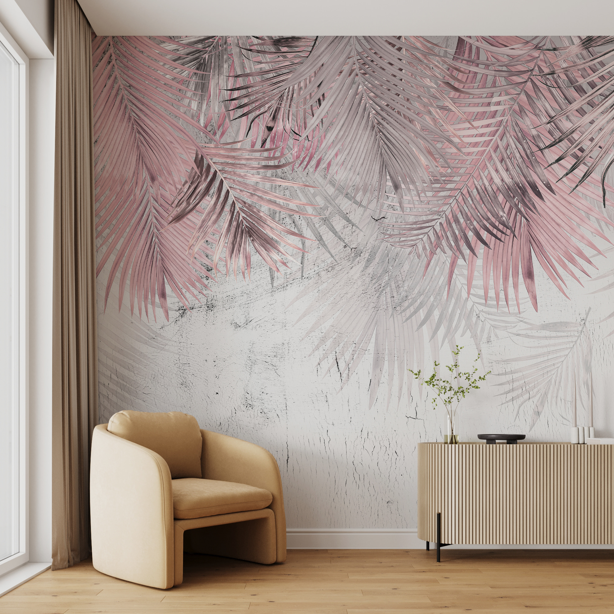 Cette peinture murale appartient à plusieurs catégories, du papier peint design aux vibrations tropicales, ce qui la rend très polyvalente. Que vous cherchiez à agrandir un petit espace ou à apporter une beauté naturelle à l’intérieur, cette pièce fait des merveilles. Ajoutez-y un éclairage doux et vous obtiendrez un sanctuaire qui vous invitera à vous détendre et à vous relaxer. Pensez à la rencontre de la nature et de l’élégance, avec une pincée de votre personnalité !