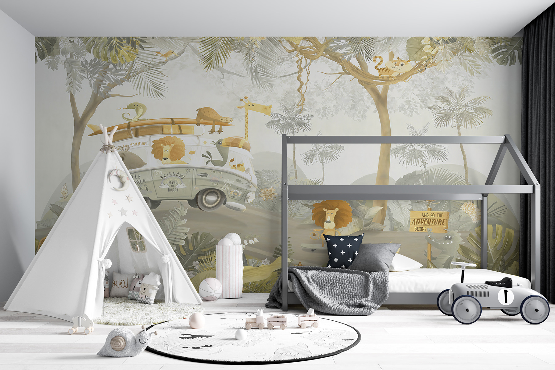 Parfaite pour les petits explorateurs, cette peinture murale ajoute une touche d’imagination à n’importe quel espace. Elle a l’allure d’un livre d’histoires, ce qui suscite instantanément des sourires et stimule la créativité. Peut-être qu’une histoire à l’heure du coucher impliquera désormais un lion qui patine au coucher du soleil, ou peut-être une visite magique de la jungle tous les matins. Abordable et charmante, cette peinture murale transforme les murs en merveilles narratives – une toile de fond parfaite pour les rêves d’enfance et les moments de jeu. Chaque coup d’œil à cette fresque nous rappelle que l’aventure est au coin de la rue.