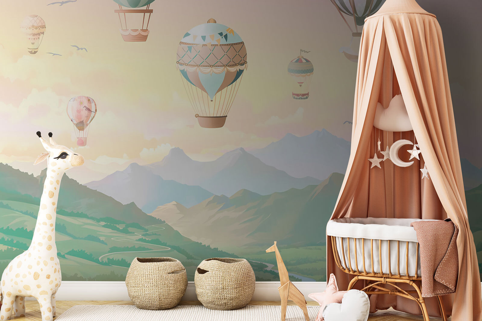 Transformez l’espace d’un enfant en un pays des merveilles fantaisiste avec cette peinture murale de montgolfière ! Imaginez : un doux lever de soleil qui projette des teintes douces dans la pièce tandis que des ballons colorés flottent sereinement dans un paysage de rêve. C’est comme si vous invitiez un peu d’aventure dans votre maison sans avoir à faire vos valises. Les enfants peuvent s’imaginer s’envoler à travers des nuages cotonneux ou organiser des goûters dans le ciel avec des drapeaux amusants qui dansent dans la brise. Et le plus beau, c’est qu’une telle peinture murale stimule non seulement la créativité, mais apporte aussi un charme serein, parfait pour l’heure de la sieste ou les séances d’écriture d’histoires. Regardez les petits visages s’illuminer de rêves de voyages fantaisistes ; c’est plus qu’un décor, c’est une invitation à l’exploration !
