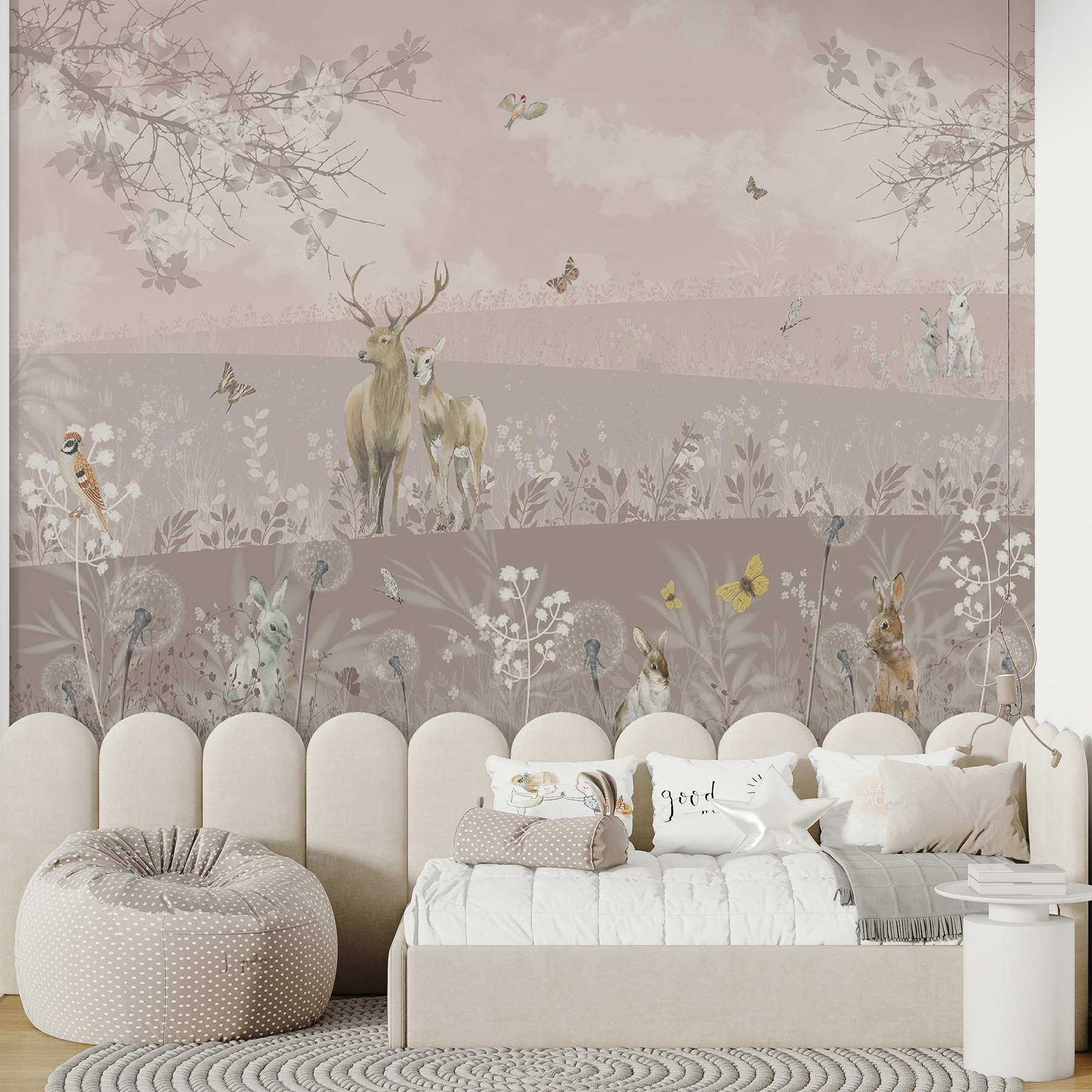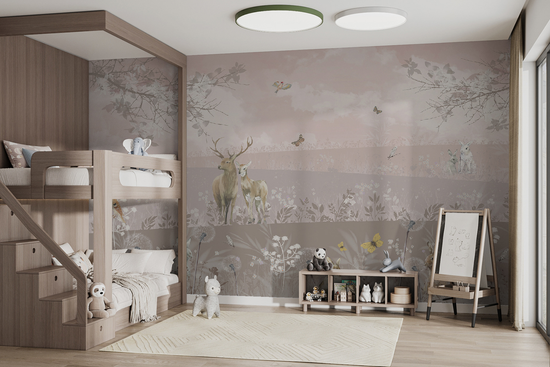 Imaginez que vous entrez dans une pièce qui ressemble à une forêt de rêve où des cerfs et des lapins se promènent en toute décontraction, sans se soucier du monde. C’est l’ambiance que vous procurera la peinture murale “Cerfs et lapins dans un paysage serein”. Elle est parfaite pour transformer n’importe quel espace en un lieu de retraite calme. Qu’il s’agisse de la chambre d’une fille, d’un coin douillet ou même du salon, cette peinture murale apporte la beauté de la nature à l’intérieur. Vous vous surprendrez à rêvasser en imaginant de douces brises et le bruissement des feuilles, tout en buvant votre café du matin. Avec ses teintes douces et ses adorables animaux sauvages, elle vous invite à lire un bon livre ou à passer un moment tranquille. Si vous souhaitez ajouter un peu de magie à vos murs, c’est la solution qu’il vous faut. Et qui ne voudrait pas d’un peu de magie forestière à la maison ?