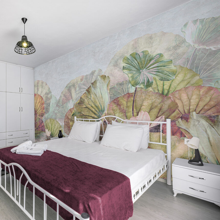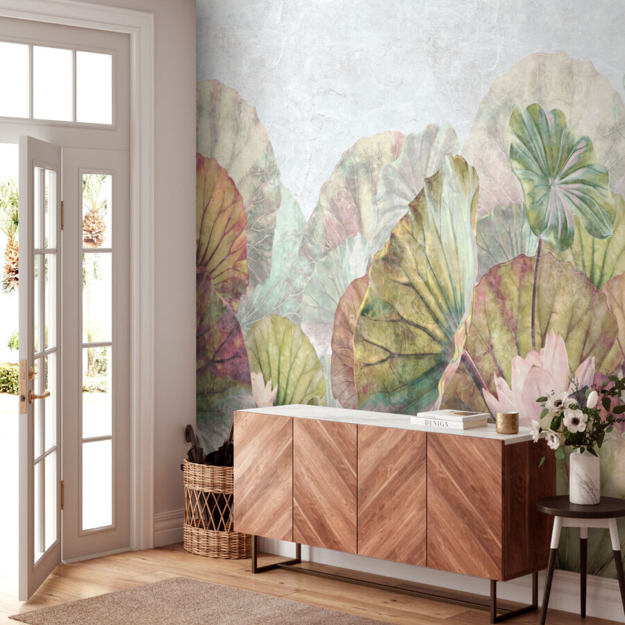Imaginez : vous entrez dans une pièce et vous êtes instantanément enveloppé par les vibrations apaisantes et sereines des feuilles de lotus peintes dans de douces couleurs pastel. Cette peinture murale n’est pas un simple papier peint – c’est comme si vous entriez dans une retraite paisible au milieu d’une ville animée. Les couleurs sont très douces et font ressortir les feuilles avec une grâce délicate.