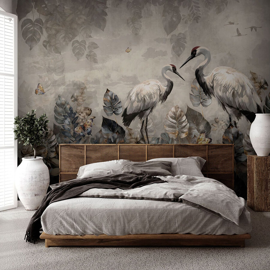 Imaginez que vous vous réveillez, que vous vous étirez et que vous vous imprégnez de la vue sereine de deux grues, dont l’une tient un poisson, juste là, sur votre mur. Cette peinture murale est plus qu’une simple décoration ; c’est comme avoir une tranche de poésie de la nature à l’intérieur. Elle danse entre les bleus lunatiques et les gris terreux, avec ces papillons qui voltigent autour de feuilles qui semblent avoir été embrassées par la fin de l’automne.