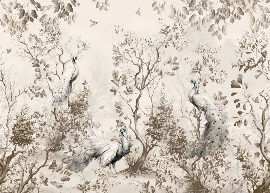 Imaginez que vous entrez dans une pièce et que vous avez l’impression d’avoir pénétré dans une forêt sereine et rêveuse où d’élégants paons blancs se promènent librement parmi les branches luxuriantes. C’est la magie de cette peinture murale ! Avec ses détails complexes et sa palette neutre et apaisante, il ajoute une douce sophistication à n’importe quel espace. Parfait pour un salon, une chambre à coucher ou même un coin lecture confortable.