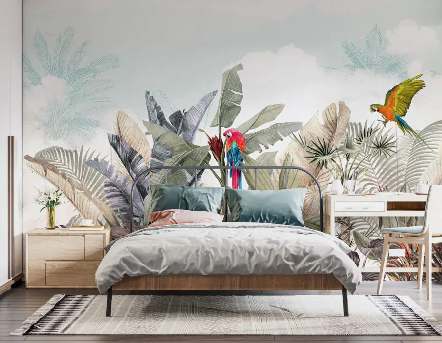 Voici votre nouvelle obsession murale : la peinture murale “Perroquet coloré volant dans les airs”. C’est comme si le rêve d’un ornithologue atterrissait en plein milieu de votre salon ! Imaginez deux perroquets vibrants planant au-dessus de verts feuillus et de fleurs tropicales. C’est comme un mini-vacances dans la forêt tropicale – sans les moustiques, Dieu merci !