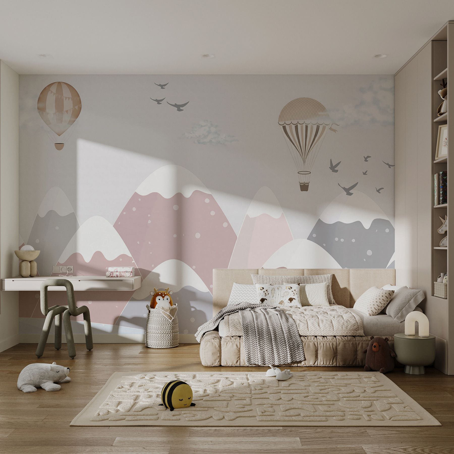 Pouvez-vous imaginer des histoires à dormir debout sous cette peinture murale ? Des histoires de voyages en montgolfière au-dessus des montagnes. Elle a un aspect classique et intemporel, mais avec une touche de douceur et de modernité. Ce n’est pas pour rien qu’il figure dans la liste des “peintures murales populaires”. Il illumine l’espace de son charme et de sa chaleur.