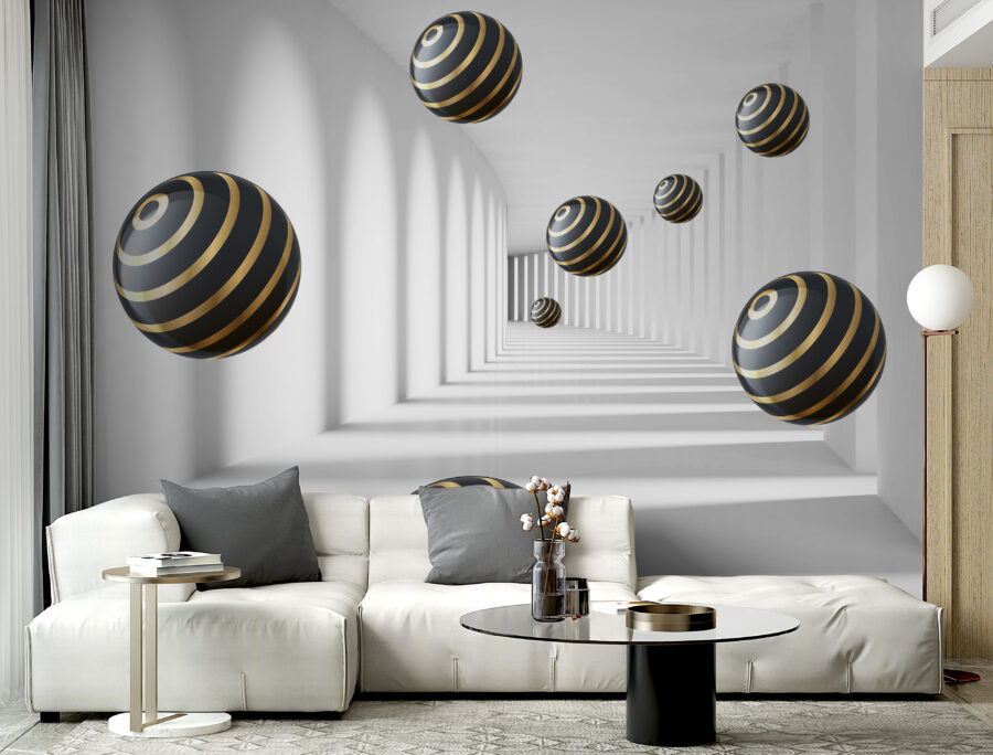 Imaginez que vous entrez dans une pièce et que vous avez l’impression d’entrer directement dans une autre dimension. C’est exactement ce que fait le “Papier peint Striped Spheres Hover in White Corridor”. Ce motif moderne, presque hypnotique, vous donne l’impression d’être dans un tunnel futuriste. Les sphères, avec leurs rayures élégantes, semblent flotter sans effort, créant un sentiment de profondeur qui peut réellement donner l’impression que votre espace est plus grand. C’est un peu comme si vous aviez votre propre décor de film de science-fiction sur votre mur !