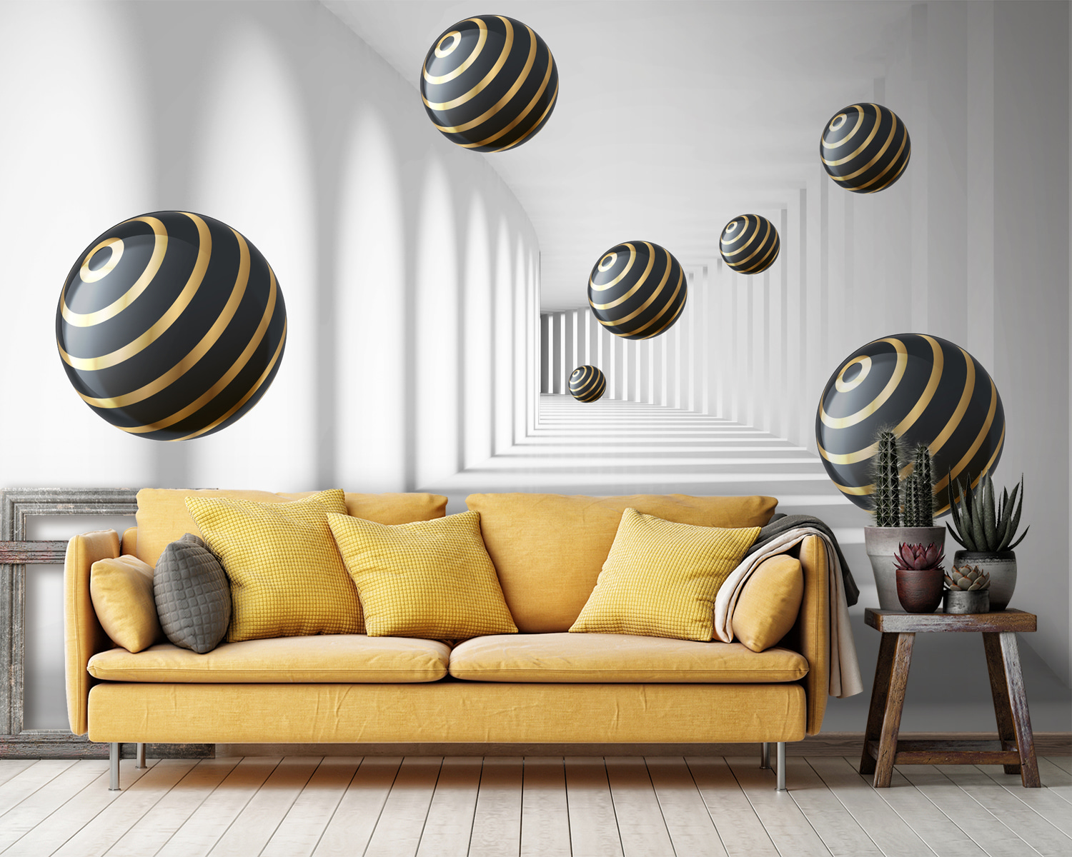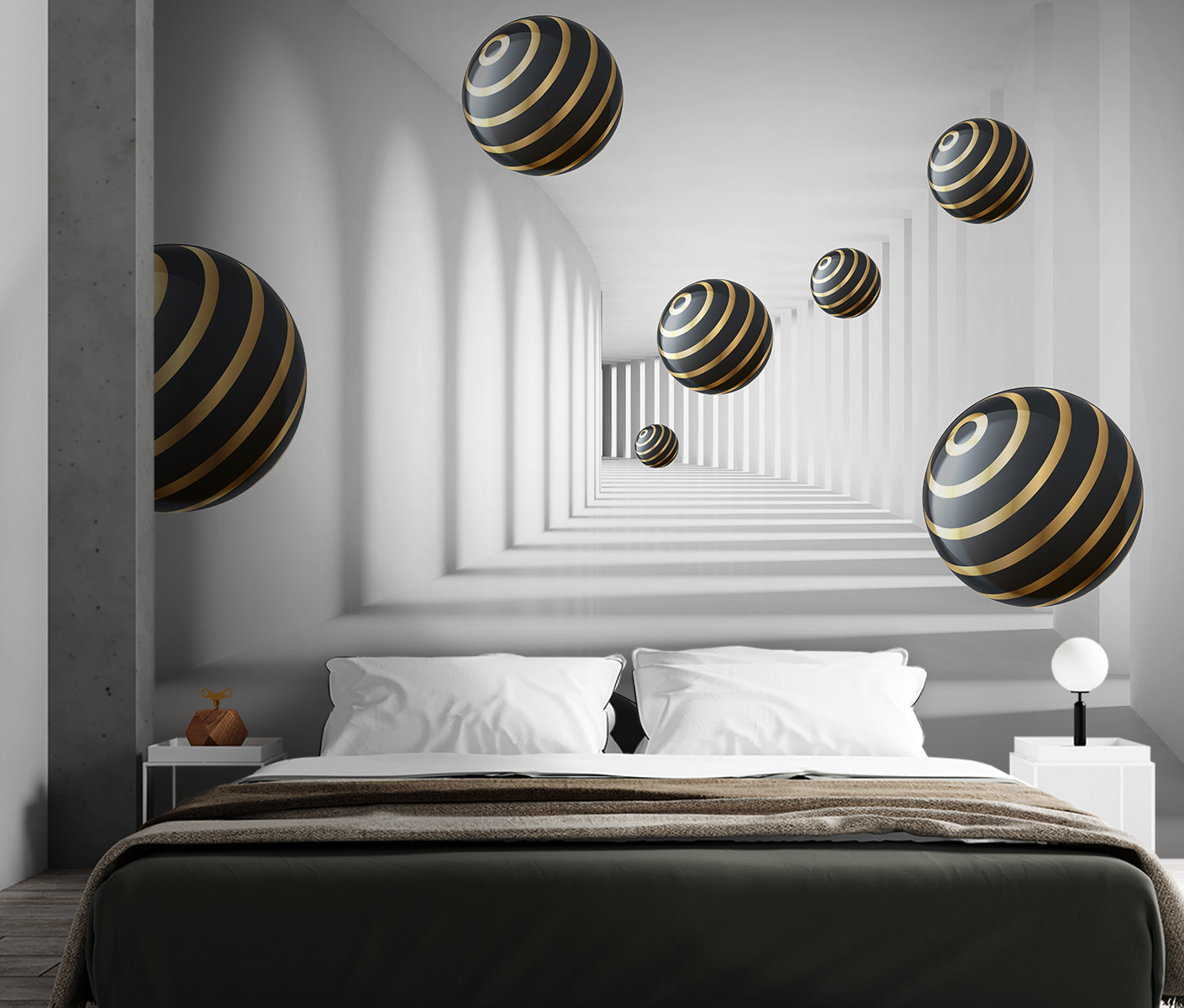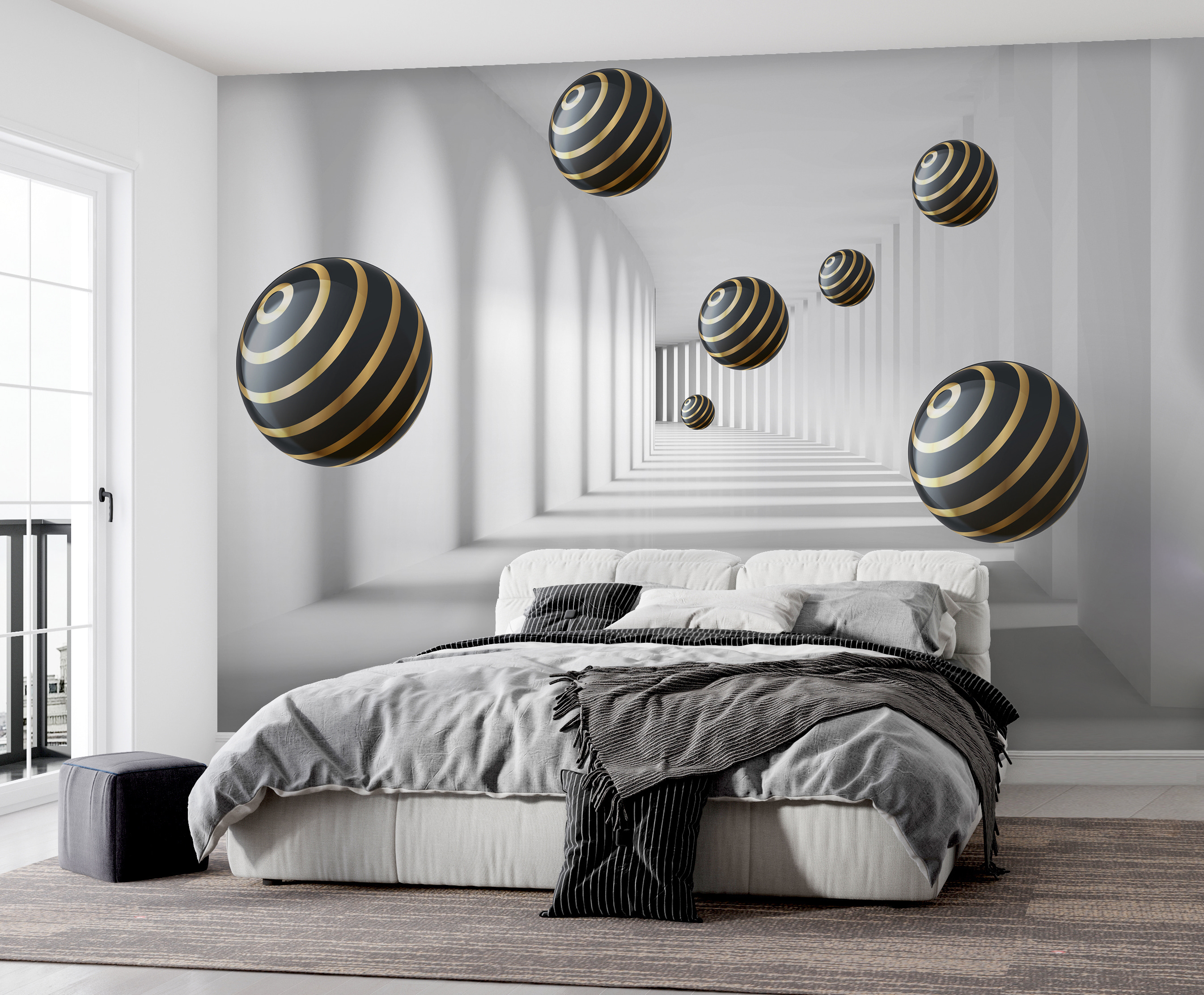 Imaginez que vous entrez dans une pièce et que vous avez l’impression d’entrer directement dans une autre dimension. C’est exactement ce que fait le “Papier peint Striped Spheres Hover in White Corridor”. Ce motif moderne, presque hypnotique, vous donne l’impression d’être dans un tunnel futuriste. Les sphères, avec leurs rayures élégantes, semblent flotter sans effort, créant un sentiment de profondeur qui peut réellement donner l’impression que votre espace est plus grand. C’est un peu comme si vous aviez votre propre décor de film de science-fiction sur votre mur !