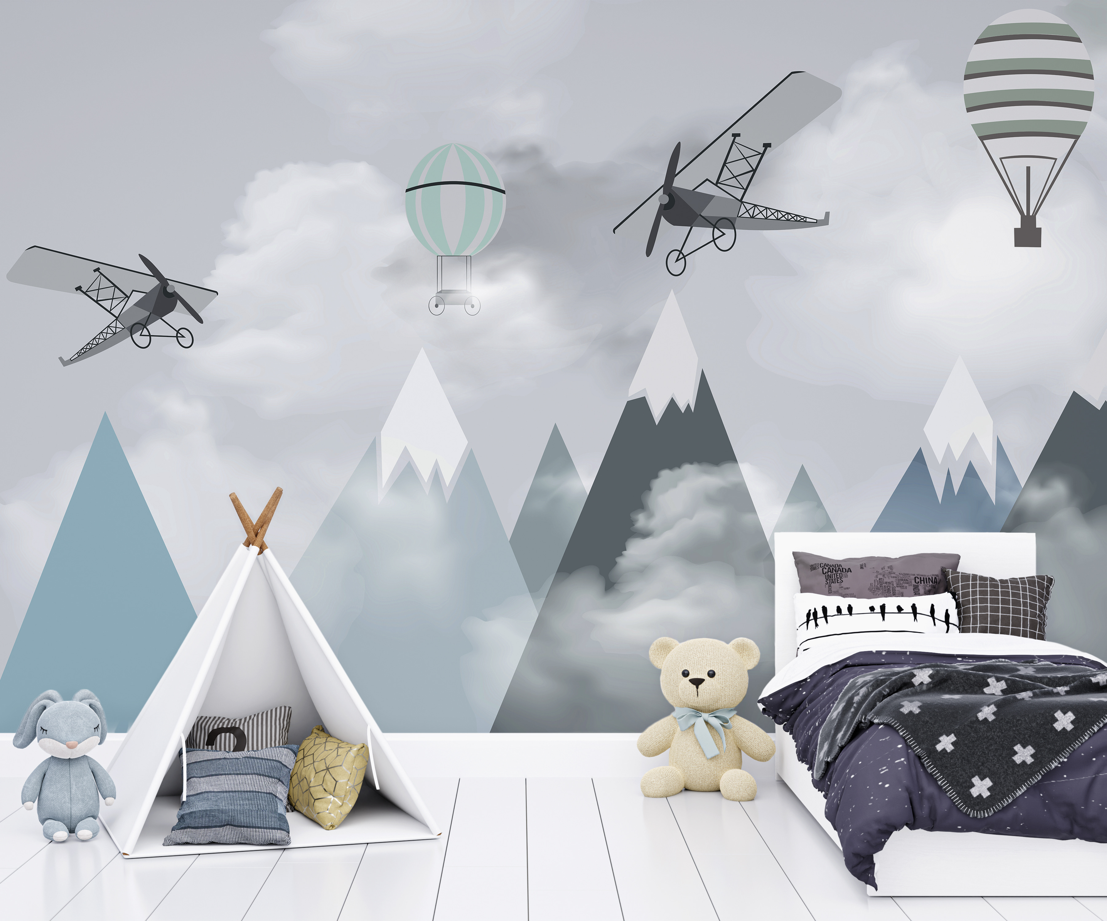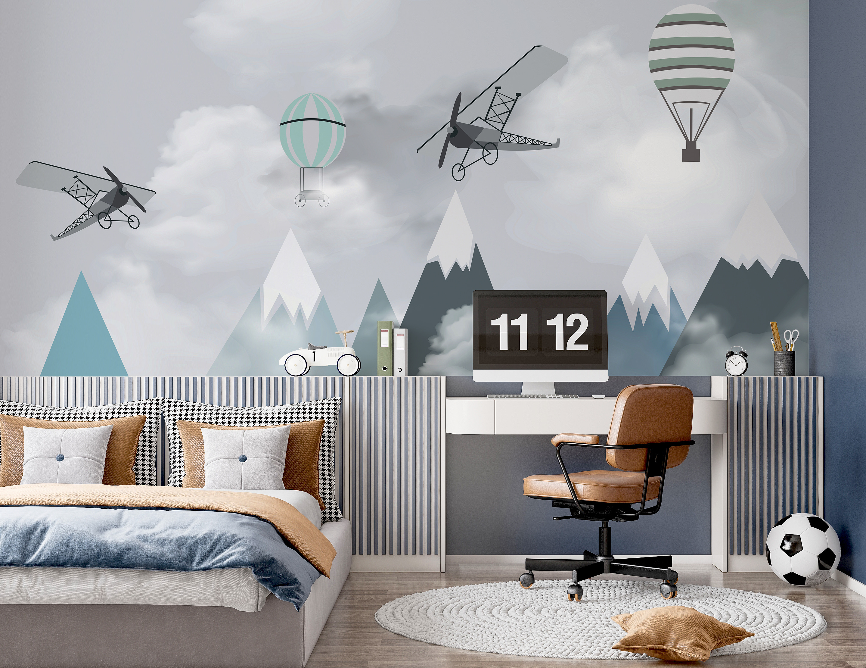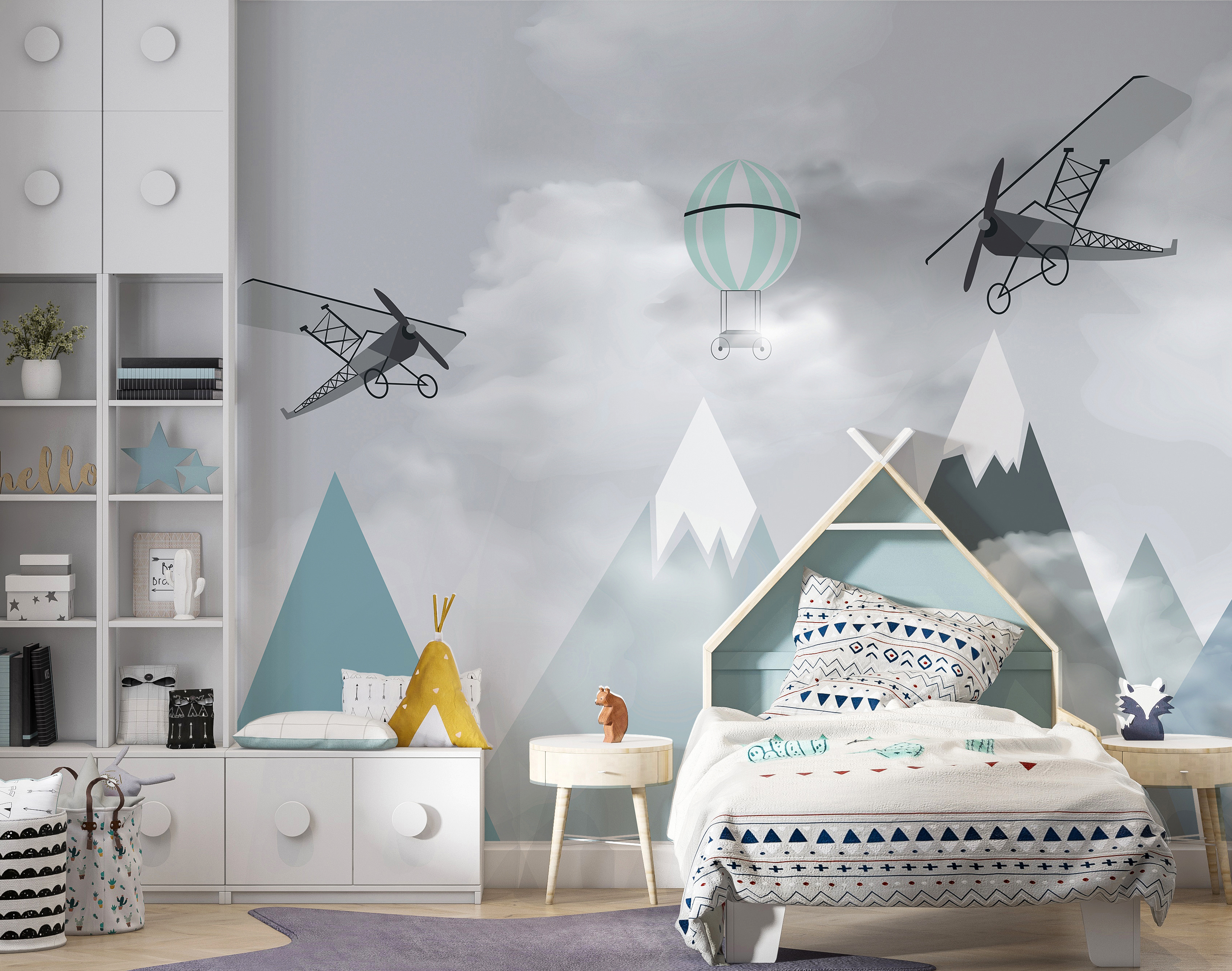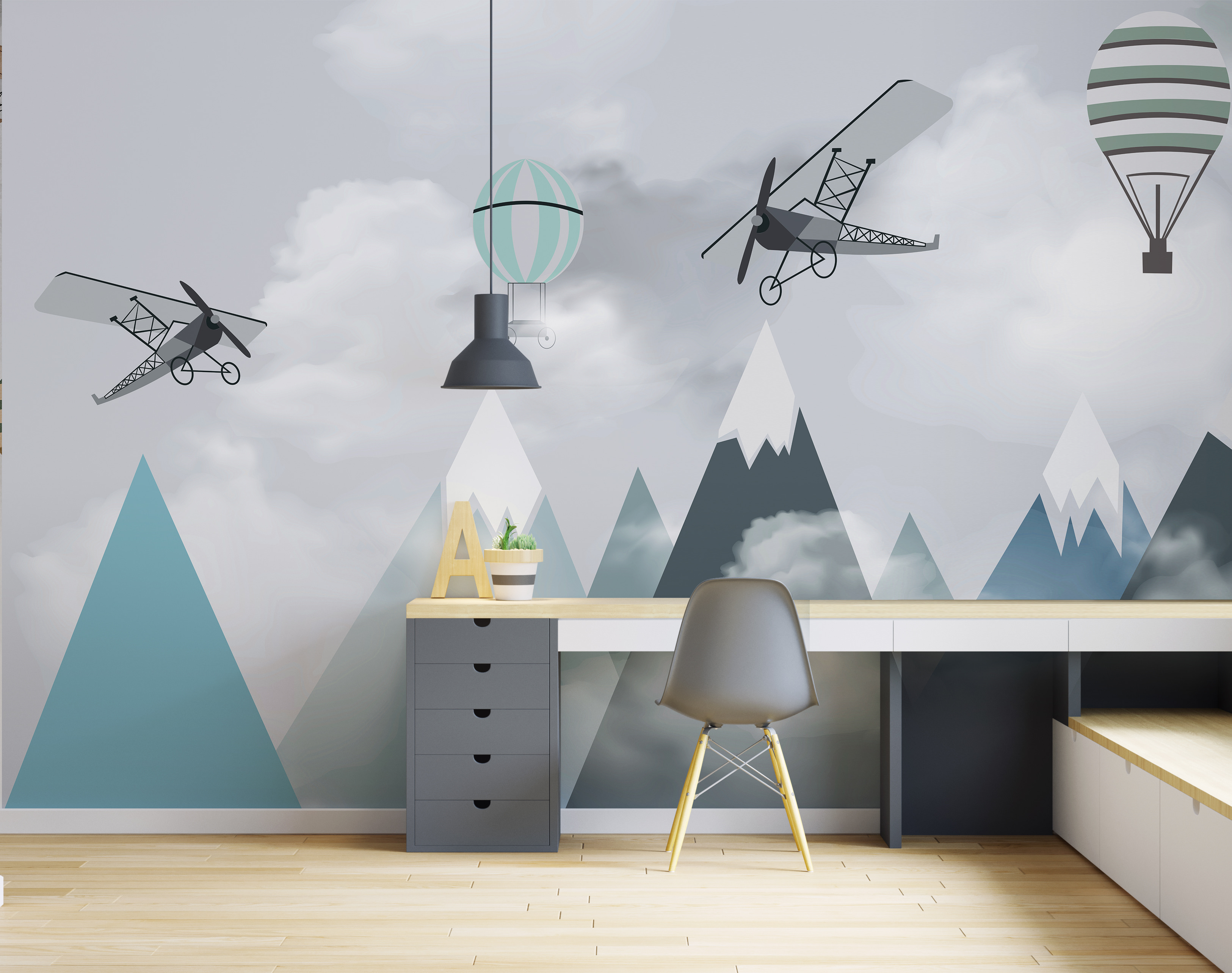 Imaginez la chambre de votre enfant se transformer en une aventure aérienne de rêve avec ce ravissant “Muraux avions et montgolfières sur montagnes”. C’est comme si vous entriez dans un livre de contes où des avions et des montgolfières fantasques dérivent paresseusement au-dessus de pics montagneux sereins. Parfait pour votre petit aviateur ou explorateur en herbe, ce tableau mural suscite un sentiment d’émerveillement et de possibilités infinies.