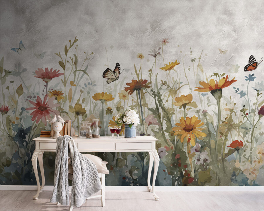 Vous avez envie de donner un coup de jeune à votre espace ? Jetez un coup d’œil à cette délicieuse peinture murale intitulée “Les papillons dansent au-dessus d’une prairie colorée”. C’est comme si quelqu’un avait mis en bouteille la joie d’une journée ensoleillée dans un champ de fleurs sauvages et l’avait étalée sur votre mur ! Les papillons flottant au-dessus de fleurs éclatantes sont un pur bonheur exposé, parfait pour tous ceux qui ont besoin d’un peu de magie de la nature dans leur vie intérieure.