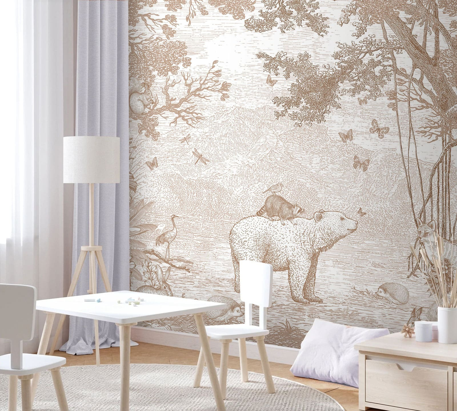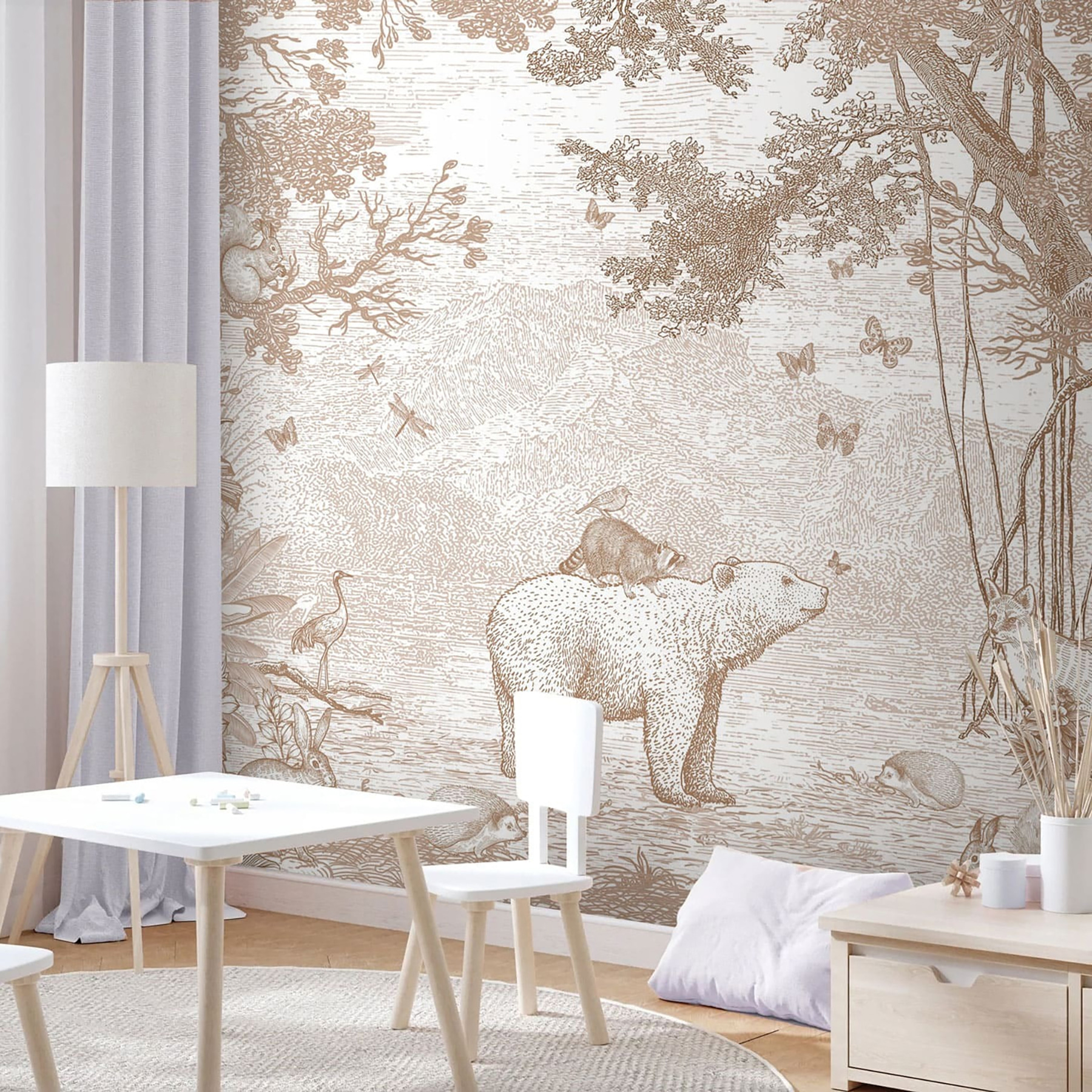 Imaginez : un charmant raton laveur perché sur le dos d’un ours, entouré de ses amis des bois. Cette peinture murale, parfaite pour une chambre d’enfant, ressemble à une page tout droit sortie d’un livre d’histoire enchanteur. Les tons sépia atténués lui confèrent une touche intemporelle, ce qui la rend apaisante et accueillante – comme un doux câlin pour les yeux. Il suscitera d’innombrables histoires à l’heure du coucher et une imagination débordante. Imaginez les yeux de votre enfant s’illuminer chaque soir. Une toile de fond parfaite pour les jeux, la sieste et tous les moments douillets entre les deux. Captivant, fantaisiste et tellement adorable !