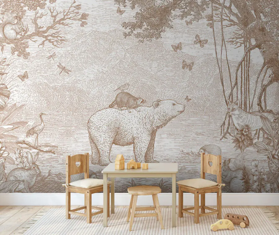 Imaginez : un charmant raton laveur perché sur le dos d’un ours, entouré de ses amis des bois. Cette peinture murale, parfaite pour une chambre d’enfant, ressemble à une page tout droit sortie d’un livre d’histoire enchanteur. Les tons sépia atténués lui confèrent une touche intemporelle, ce qui la rend apaisante et accueillante – comme un doux câlin pour les yeux. Il suscitera d’innombrables histoires à l’heure du coucher et une imagination débordante. Imaginez les yeux de votre enfant s’illuminer chaque soir. Une toile de fond parfaite pour les jeux, la sieste et tous les moments douillets entre les deux. Captivant, fantaisiste et tellement adorable !