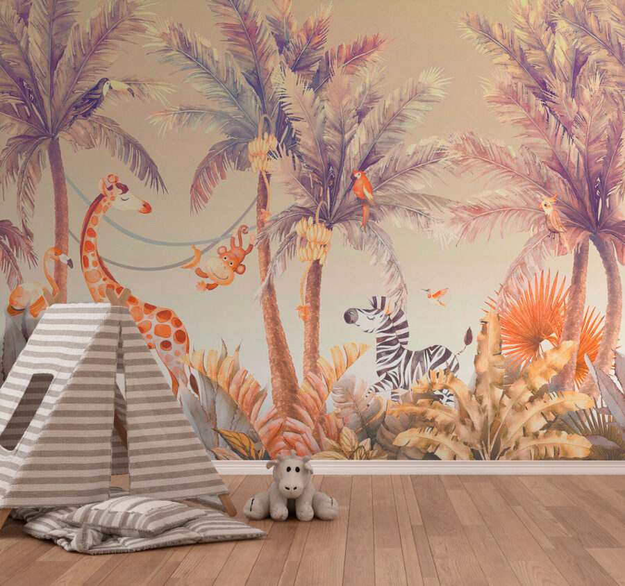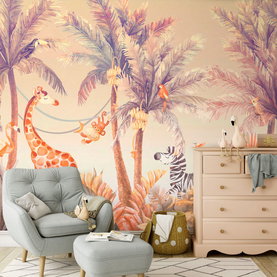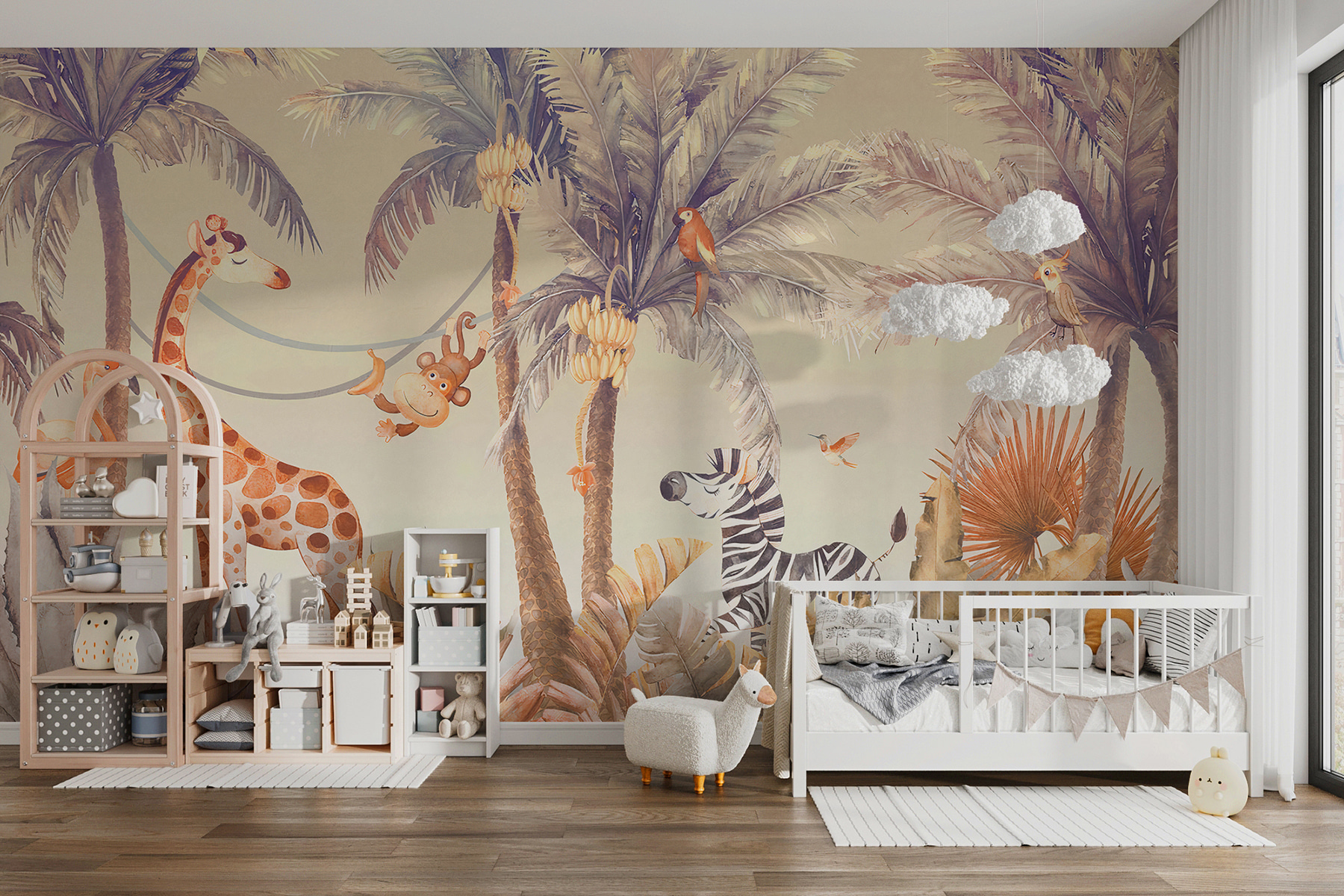 Imaginez que vous entrez dans une pièce et que vous êtes accueilli par une fête dans la jungle ! Cette peinture murale, qui met en scène une bande d’animaux en train de prendre le soleil, apporte un sentiment d’aventure dans votre maison. Un singe joyeux se balance dans un hamac confortable à côté d’une girafe amicale, tandis qu’un zèbre et un flamant rose ajoutent à l’ambiance. C’est comme si la jungle avait décidé d’organiser une petite fête du soleil, et vous êtes invité ! Cette peinture murale est parfaite pour les chambres d’enfants – pensez à l’étincelle dans leurs yeux et aux histoires imaginatives qui pourraient se dérouler. Plus qu’un simple décor, c’est un billet pour une aventure ludique quotidienne. Une touche de couleur, un soupçon de fantaisie et beaucoup de joie vous attendent !