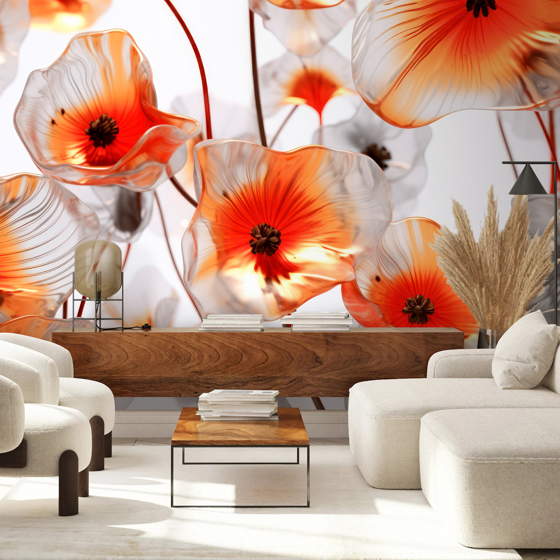 Imaginez : votre mur est pratiquement recouvert de ces magnifiques fleurs translucides, chacune d’entre elles présentant un centre orange vibrant qui fait sensation. Il ne s’agit pas d’une simple peinture murale, mais d’une véritable explosion de vie, directement sur votre mur. Imaginez que vous entrez dans votre salon et que vous vous sentez instantanément stimulé par ces fleurs lumineuses, plus grandes que nature. C’est un peu comme si elles se balançaient au gré de la brise qui souffle par une fenêtre ouverte.