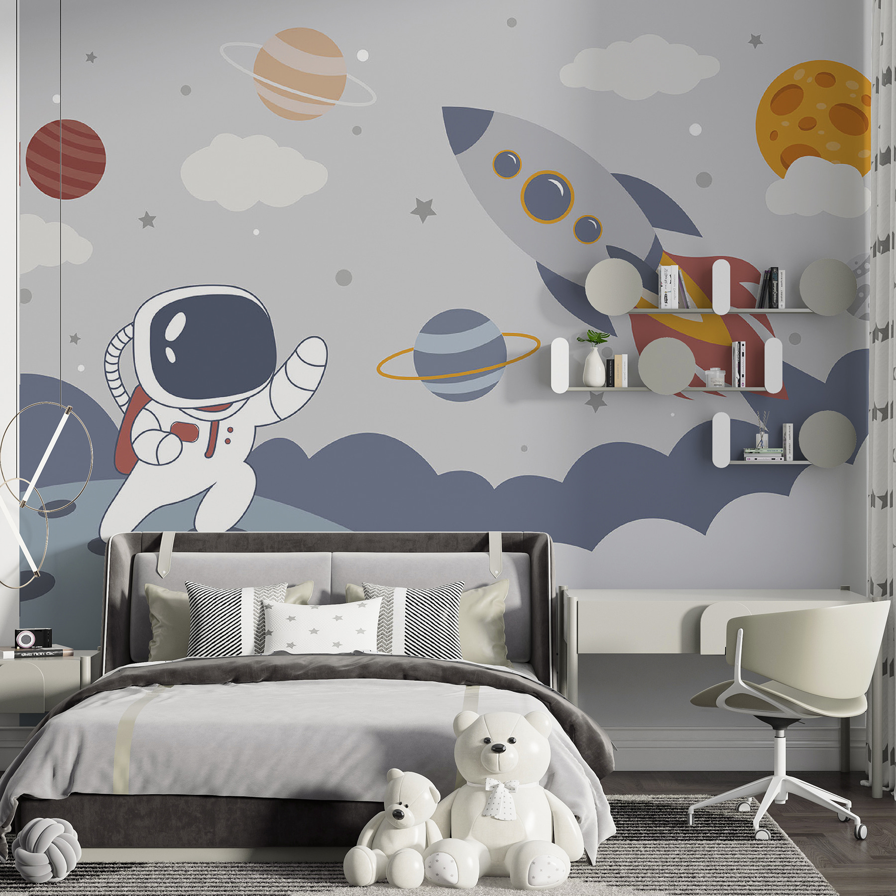 Transformer l’espace d’un enfant en une aventure cosmique est aussi facile que cette peinture murale représentant un charmant astronaute et des planètes vibrantes. Imaginez votre enfant contemplant cette scène hors du commun, rêvant de voyages dans l’espace et d’escapades intergalactiques. Le design ludique apporte une dose d’imagination, parfaite pour éveiller la curiosité sur l’univers. Ces anneaux colorés et ces nuages fantaisistes invitent à la rêverie et au voyage, rendant l’heure du coucher un peu moins ordinaire. Ce n’est pas seulement une décoration, c’est une porte vers une galaxie d’émerveillement et de joie !
