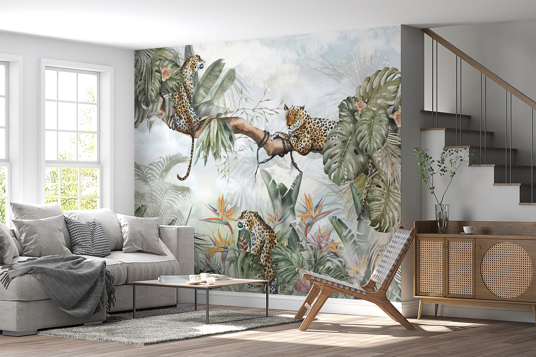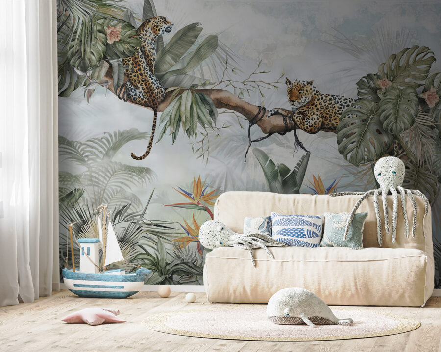Transformez votre espace avec cette peinture murale enchanteresse représentant des léopards dans une jungle luxuriante. Imaginez un coin douillet où les enfants peuvent laisser libre cours à leur imagination, qu’il s’agisse d’histoires aventureuses d’explorateurs de la jungle ou d’après-midi tranquilles, blottis dans un livre. Ces léopards espiègles perchés dans les arbres feuillus susciteront la curiosité et l’émerveillement. La verdure éclatante et les fleurs colorées créent une toile de fond joyeuse, fraîche et vivante. C’est l’idéal pour ajouter une touche de nature à l’intérieur, en faisant de chaque regard une mini évasion. Alors, respirez l’ambiance de la jungle et commencez à vous amuser !